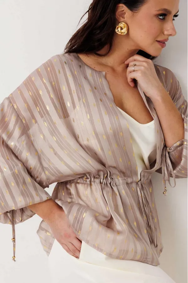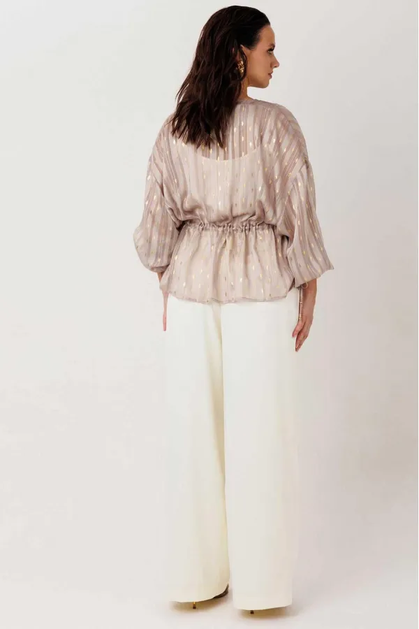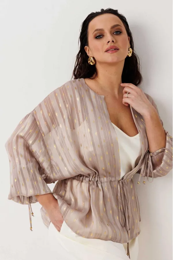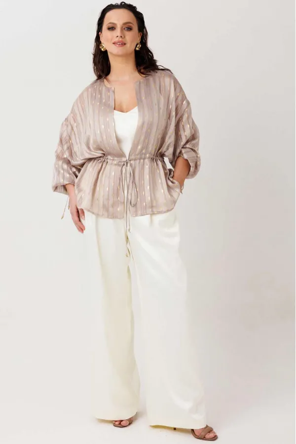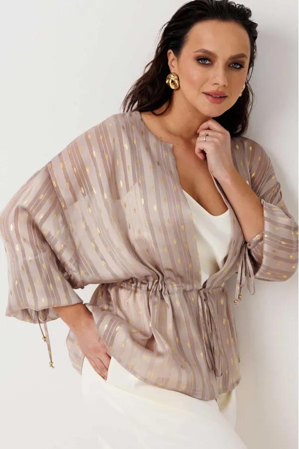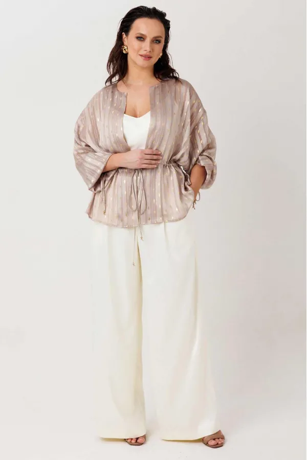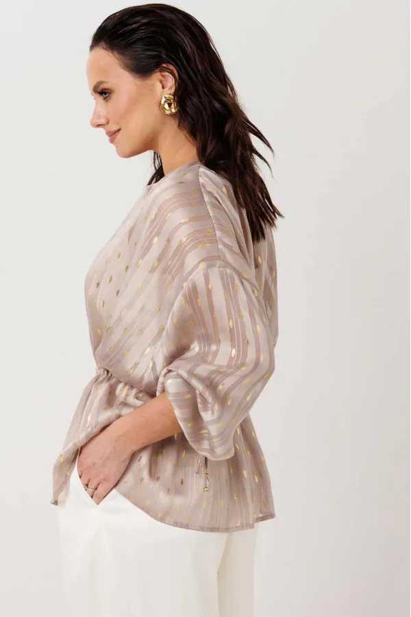 Воздушная блуза свободного прямого силуэта, которая мягко струится по фигуре и создаёт ощущение лёгкости в каждом движении. Модель без застёжки — удобно надевается и идеально подходит для расслабленных, но стильных образов. Ткань с тонким блеском и деликатным узором добавляет изысканности, делая образ более нарядным без лишней перегруженности. Линия талии регулируется за счёт кулиски — можно подчеркнуть силуэт или оставить свободную посадку. Объёмные рукава усиливают эффект лёгкости и придают модели современное звучание.