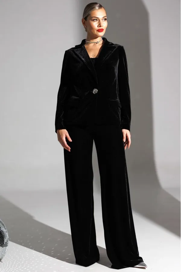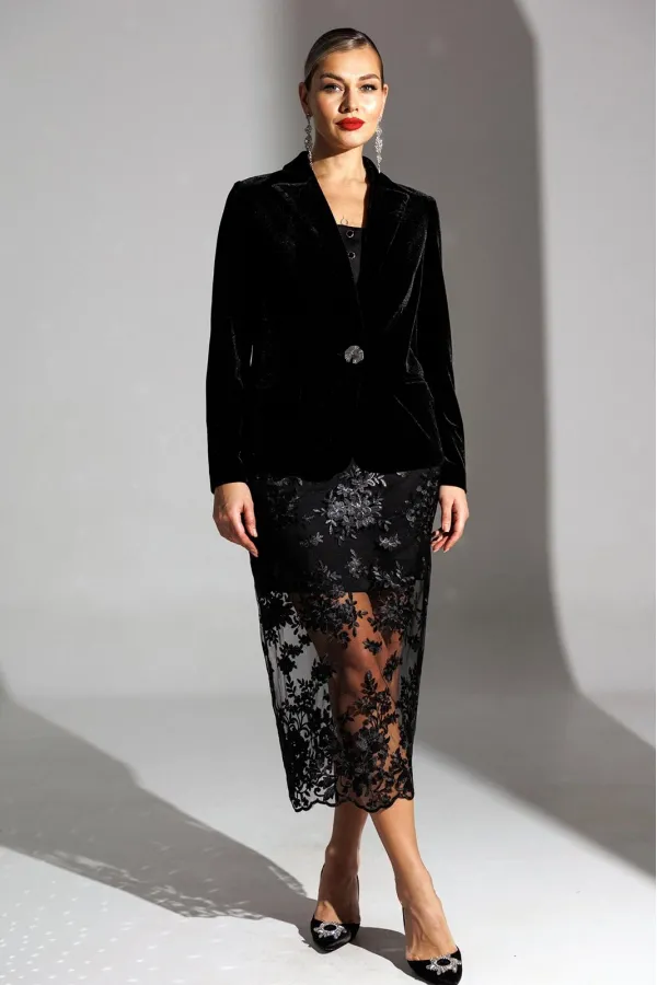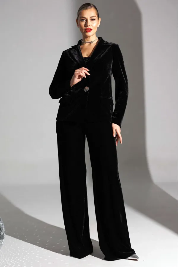 Наш бархатный жакет - это не просто вещь, это ключ к безупречному праздничному образу. Его мягкий блеск и королевская фактура делают его главным героем любого ансамбля.