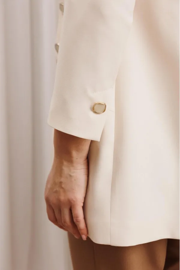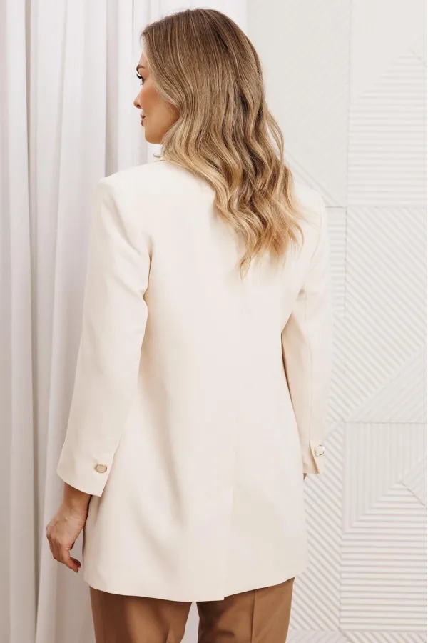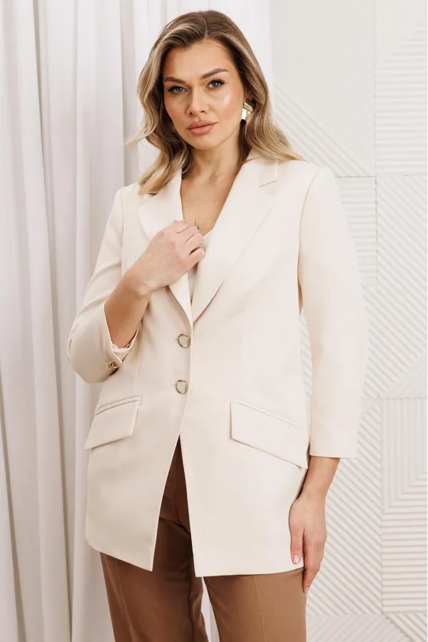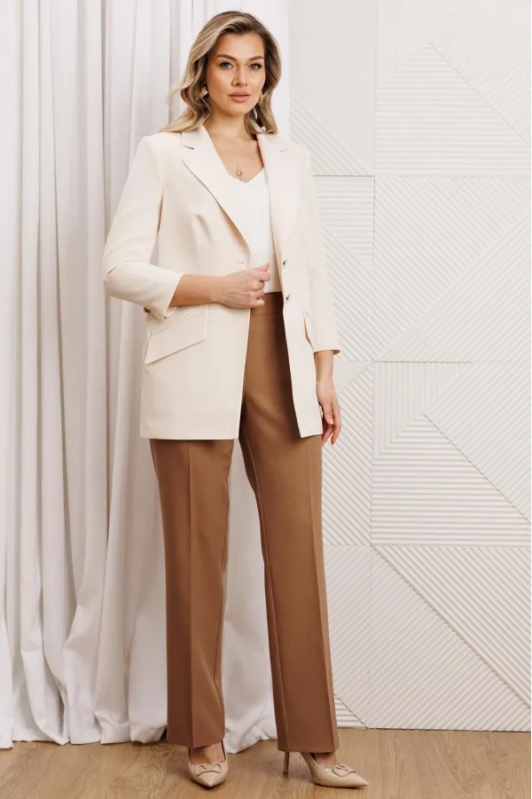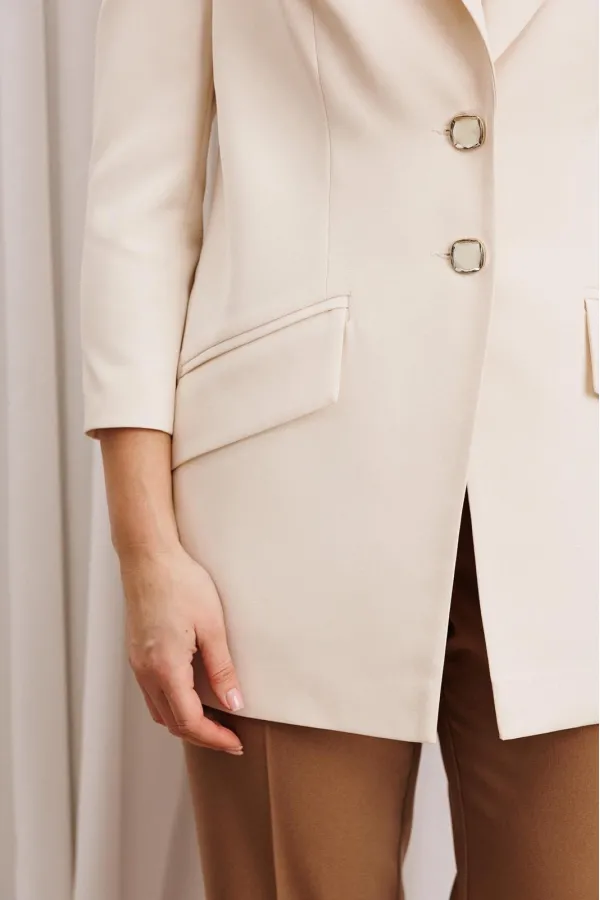 Жакет выполнен в классическом стиле с полуприлегающим силуэтом. Он удлиненный, имеет центральную застежку на одну пуговицу и элегантные детали, такие как спинка с средним швом и шлицей, а также перед с талиевыми вытачками и наклонными карманами с клапанами. Воротник пиджачного типа добавляет строгости, а втачные двухшовные рукава длиной 3/4 со шлицей в локтевом шве и пуговицей придают жакету изысканный вид.
