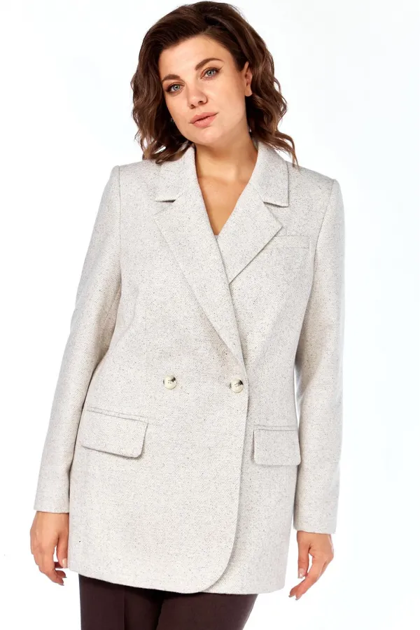 Стильный жакет из мягкой плотной костюмной ткани, прямого силуэта. Пиджачный воротник, двубортная застежка, карнамы с клапанами. Слева вверху декоративная листочка. По спинке шлица. Рукава втачные, внизу шлицы и пуговицы.