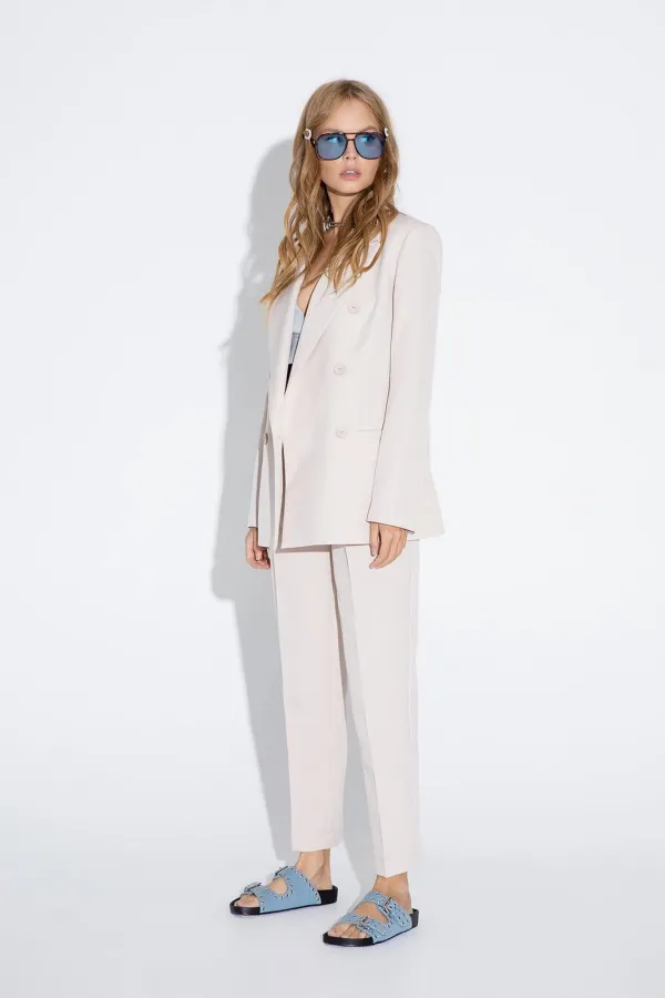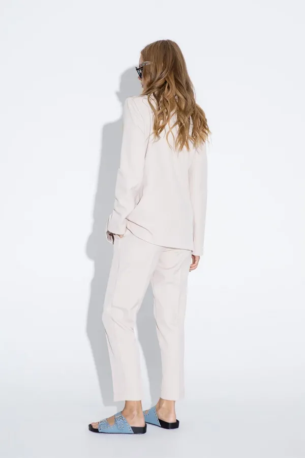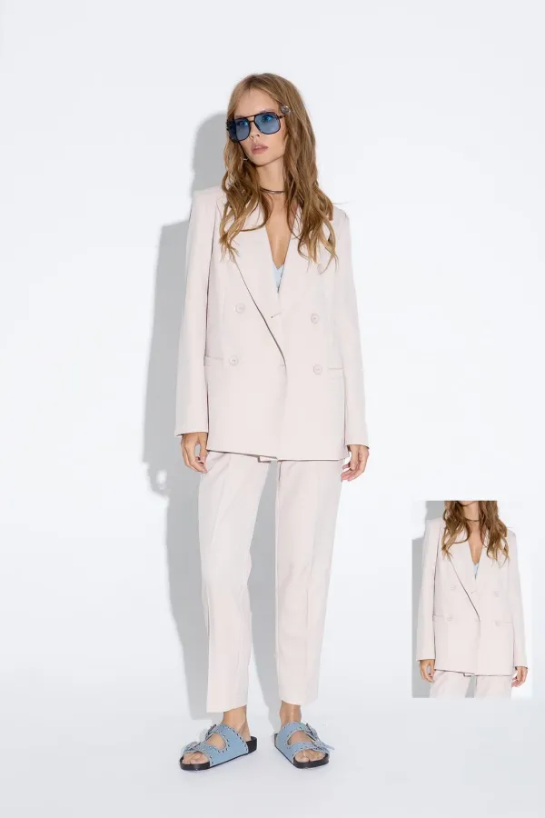 Текстильный классический жакет прямого кроя. Детали: жакет полуприлегающего силуэта, пиджачный воротник, перед с прорезными карманами, двубортная застежка на петли и пуговицы, спинка со средним швом, рукава втачные двухшовные, жакет на подкладке