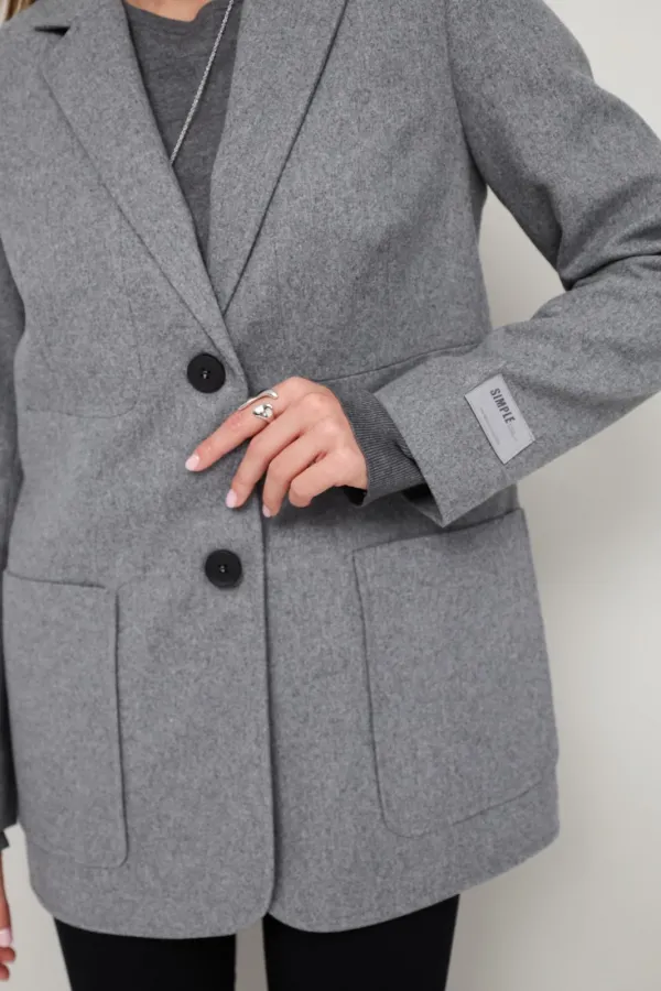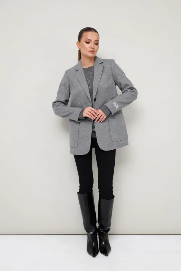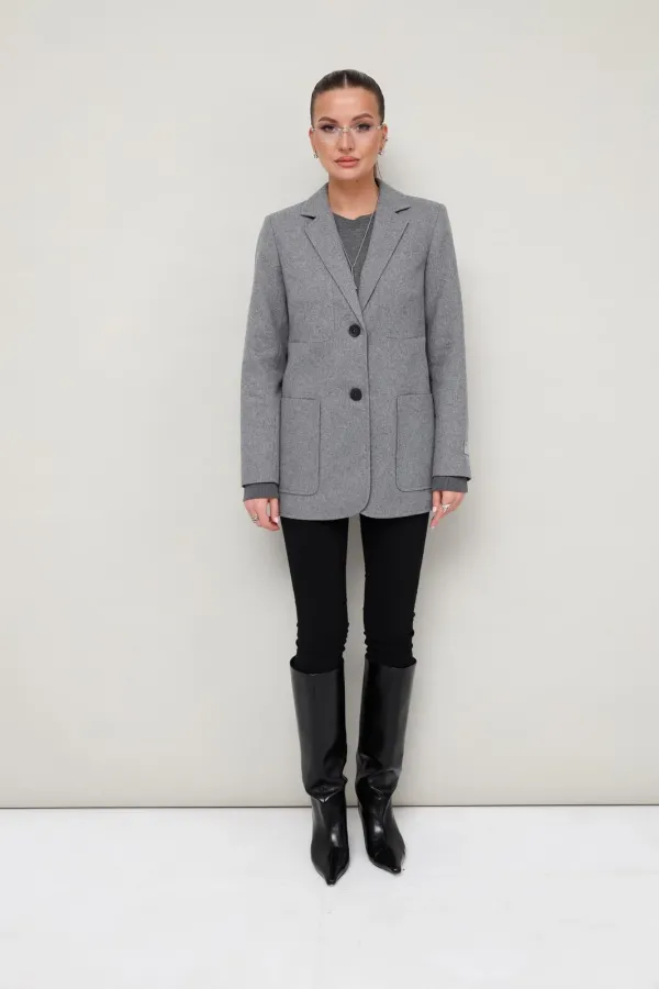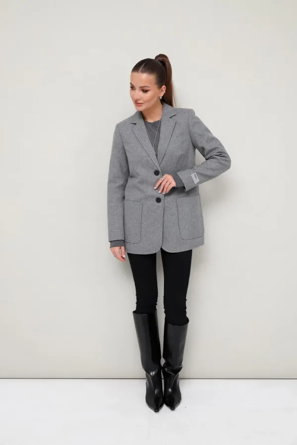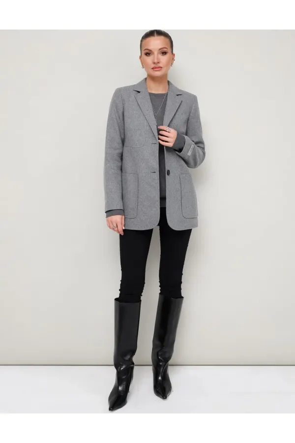 Стильный жакет полуприлегающего силуэта, выполнен из костюмной ткани. Воротник пиджачного типа с отложными лацканами. Застежка центральная на петли и пуговицы. Спереди обработаны накладные карманы, в области груди подрезы с нагрудными вытачками. Спинка с рельефами и средним швом, переходящим в шлицу. Рукава втачные двухшовные, на левом рукаве декоративная нашивка. Изделие на подкладке.