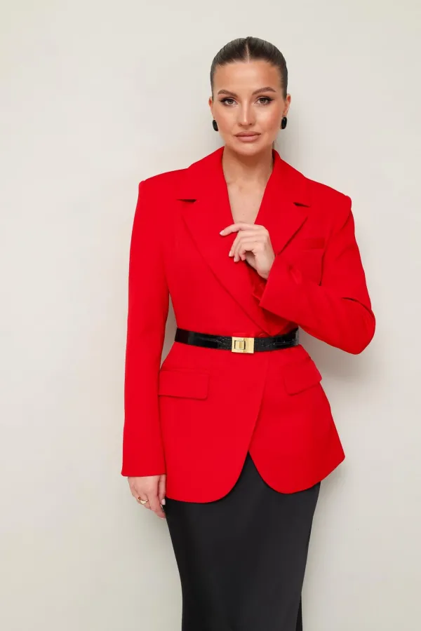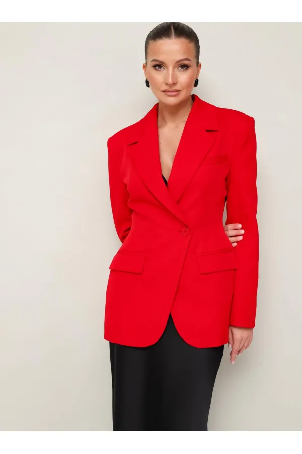 Силуэтный жакет с подчеркнутой линией талии. Смещенная застежка на петлю и пуговицу. Воротник пиджачного типа с отложными лацканами, край борта скругленный по низу жакета. Спереди обработаны прорезные карманы в рамку с клапанами и нагрудный прорезной карман с листочкой. Рукава втачные, двухшовные с отлетнымм шлицами. Спинка с рельефами и средним швом, переходящим в шлицу. Изделие на подкладке.