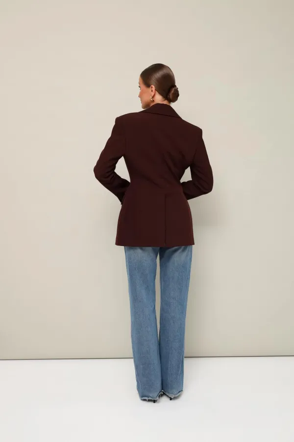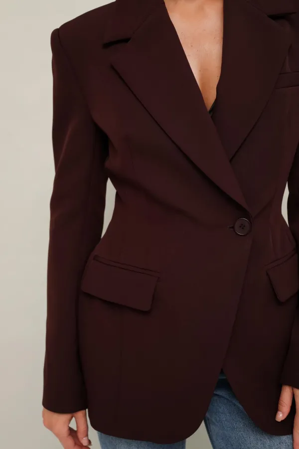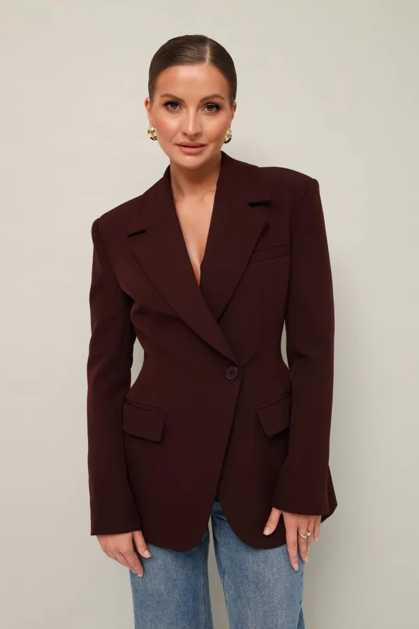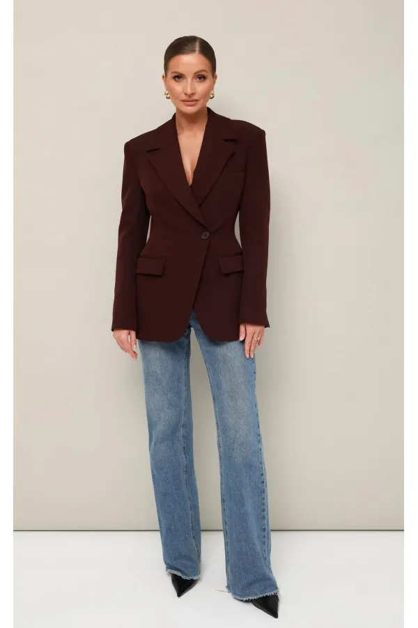 Силуэтный жакет с подчеркнутой линией талии. Смещенная застежка на петлю и пуговицу. Воротник пиджачного типа с отложными лацканами, край борта скругленный по низу жакета. Спереди обработаны прорезные карманы в рамку с клапанами и нагрудный прорезной карман с листочкой. Рукава втачные, двухшовные с отлетнымм шлицами. Спинка с рельефами и средним швом, переходящим в шлицу. Изделие на подкладке.