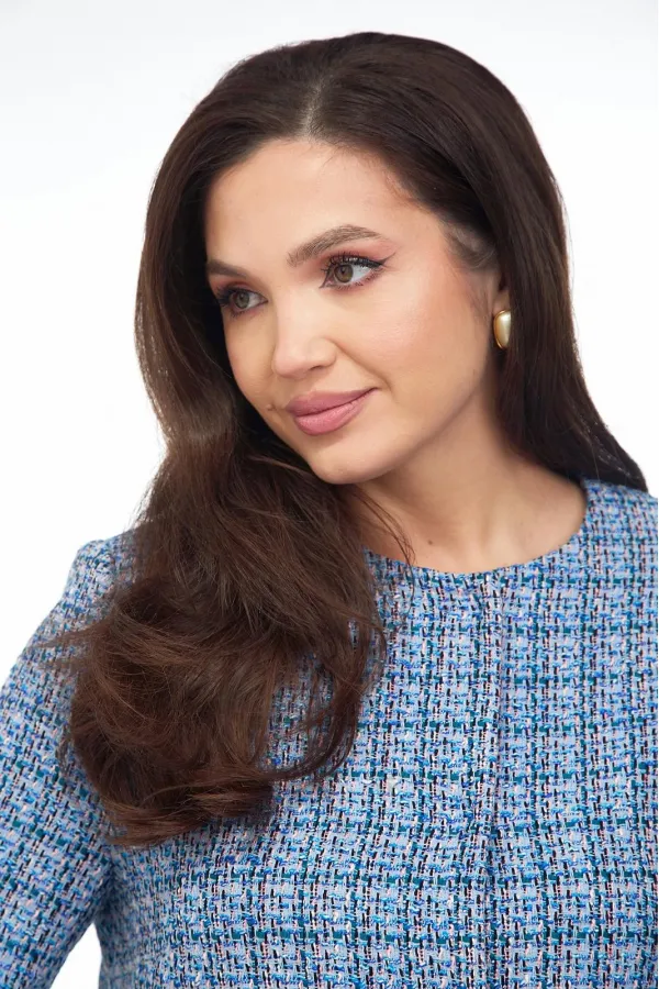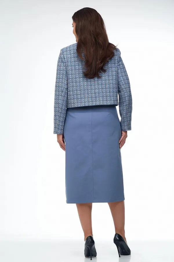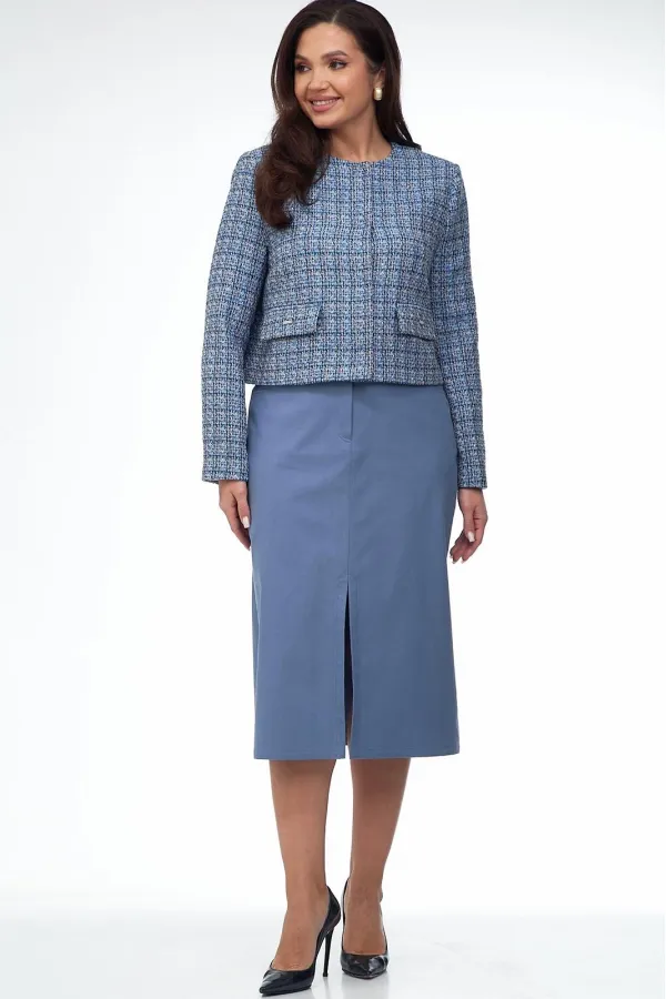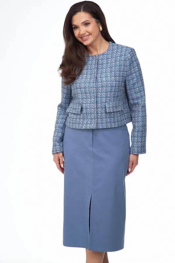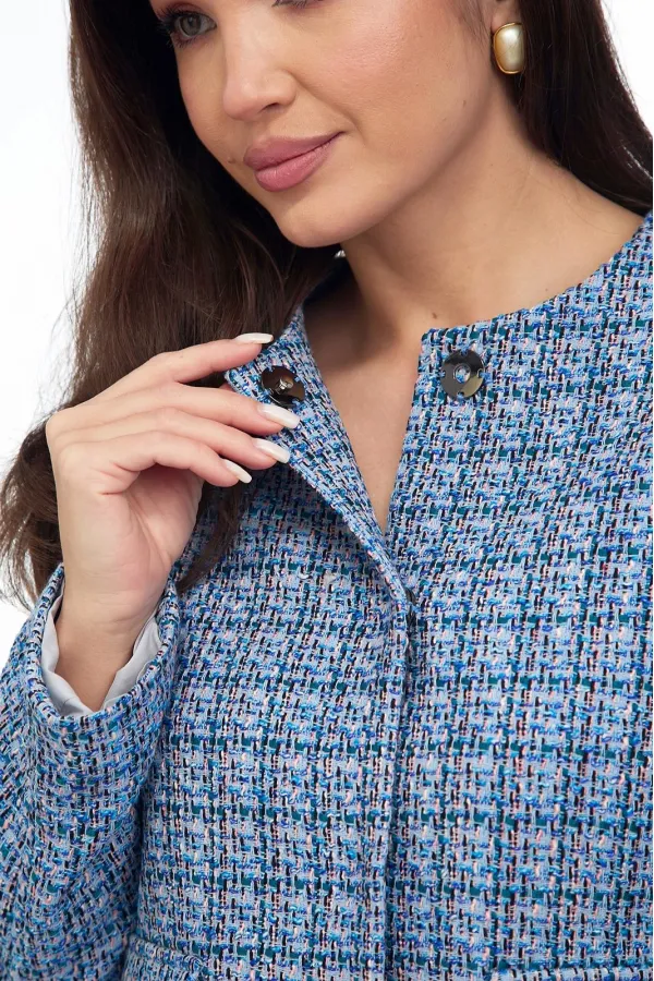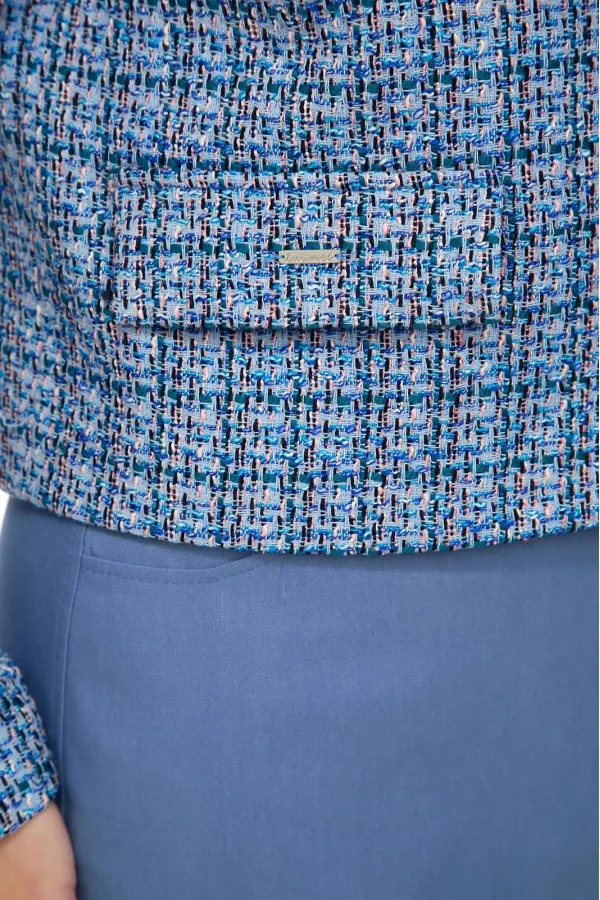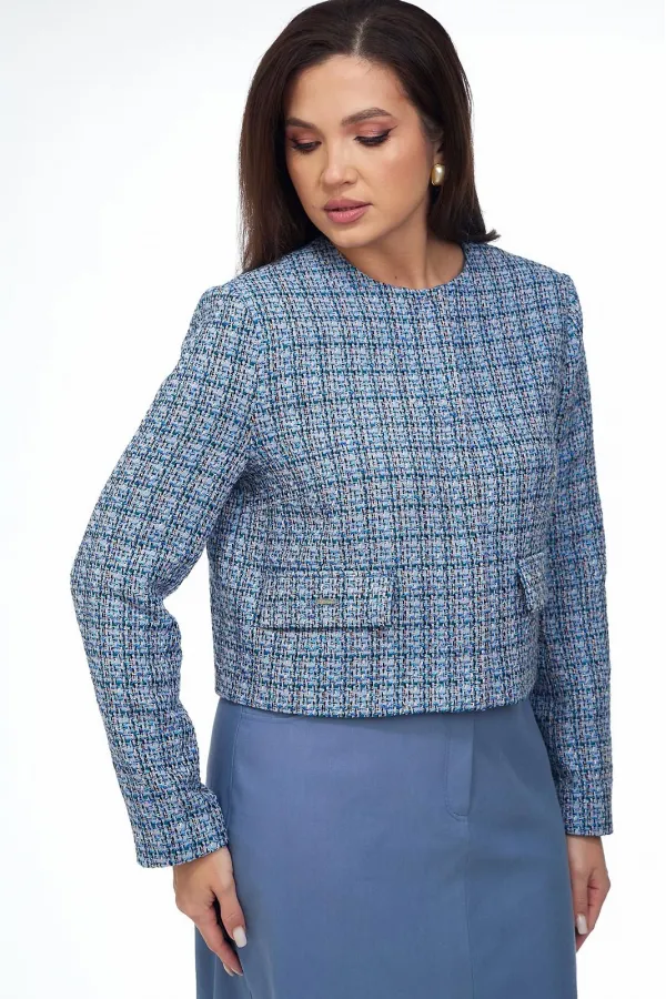 Жакет из ткани «Шанель» на подкладке, прямого силуэта, без воротника с центральной бортовой застежкой на пришивные кнопки. Перед с нагрудными вытачками и клапаном. Рукав втачной двухшовный. Вырез горловины круглый.