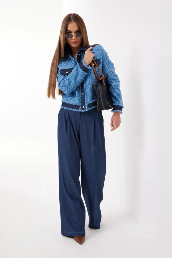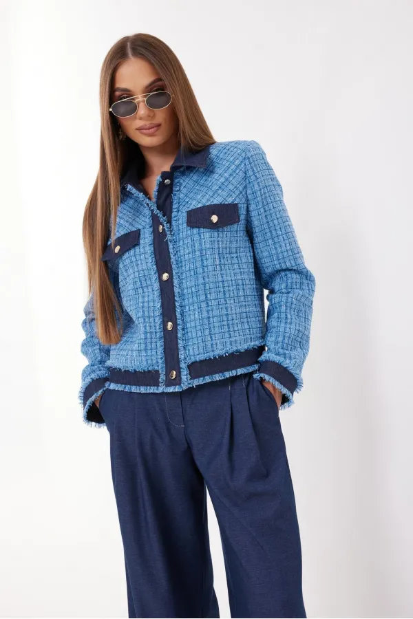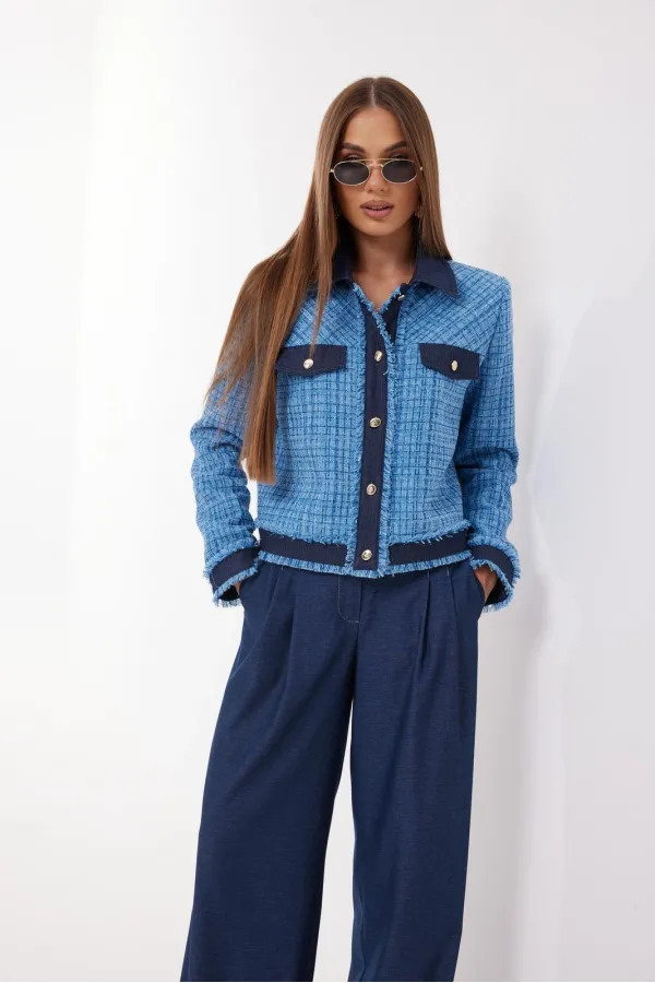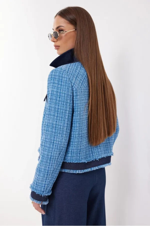 Жакет женский в стиле «шанель» прямого силуэта, длиной выше линии бедер, на подкладке, застежка центральная на планку с петлями и пуговицами. По спинке и переду кокетки, выкроенные по косой, в швах кокеток клапаны из отделочной ткани. Воротник стояче-отложной. Рукав втачной двухшовный с притачными манжетами из отделочной ткани. Воротник, планки, клапаны, манжеты и планка по низу жакета - из отделочной ткани. По швам притачивания планок и манжет декоративная бахрома из основной ткани.