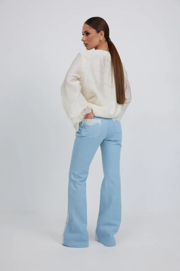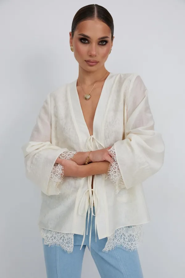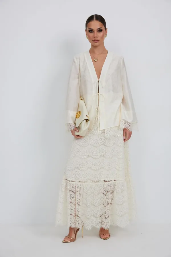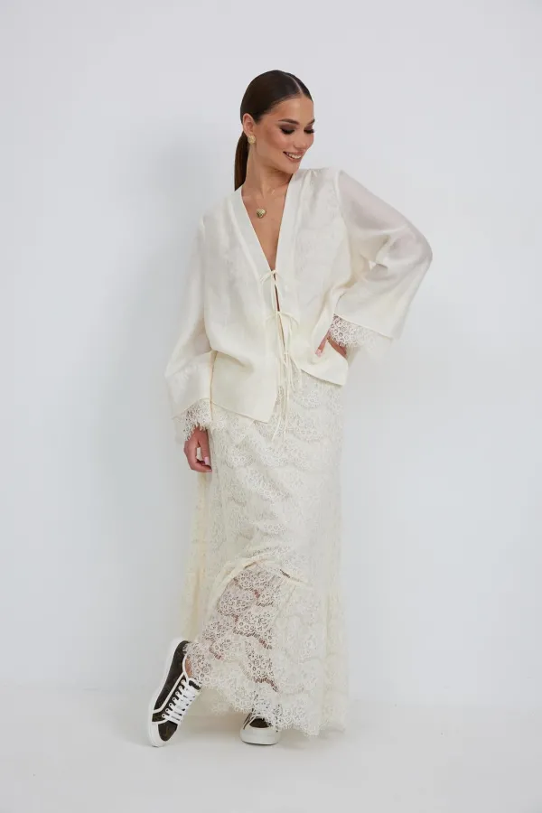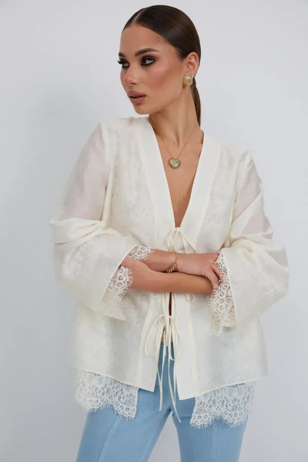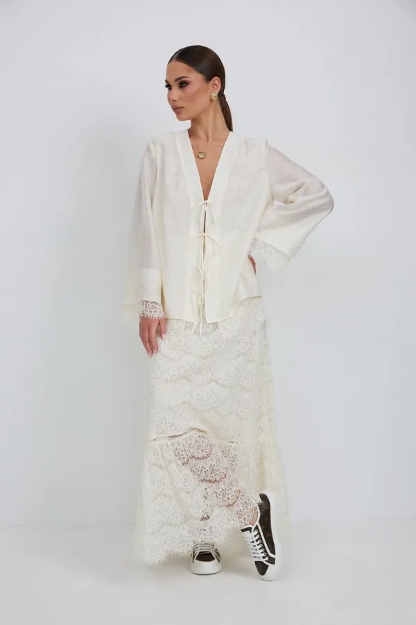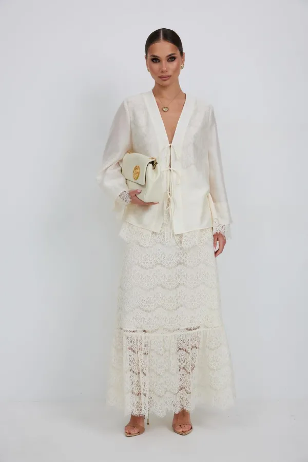 Жакет женский свободного силуэта, из полупрозрачной вуали. Спинка и перед на кружевной подкладке. Застежка на планку с тремя завязками. Рукав втачной длинный расширенный книзу, по низу рукава кружевная широкая манжета, имитирующая многослойность.