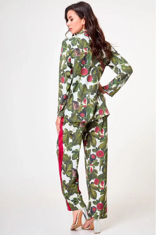 Классическая пижама с бархатными лампасами по боковым швам и актуальным принтом. Предназначена не только для дома, но и для смелых модниц для повседневной носки. В ней вам будет невероятно комфортно, как на работе, так и во время прогулки /свидания. Верх длиной до бедра, с классическим воротником, по краю декорирован кантом, застежка на петли пуговицы. На левой половинке переда нагрудный карман. Рукав длинный.