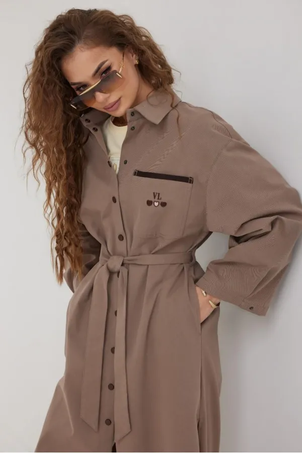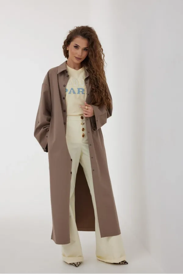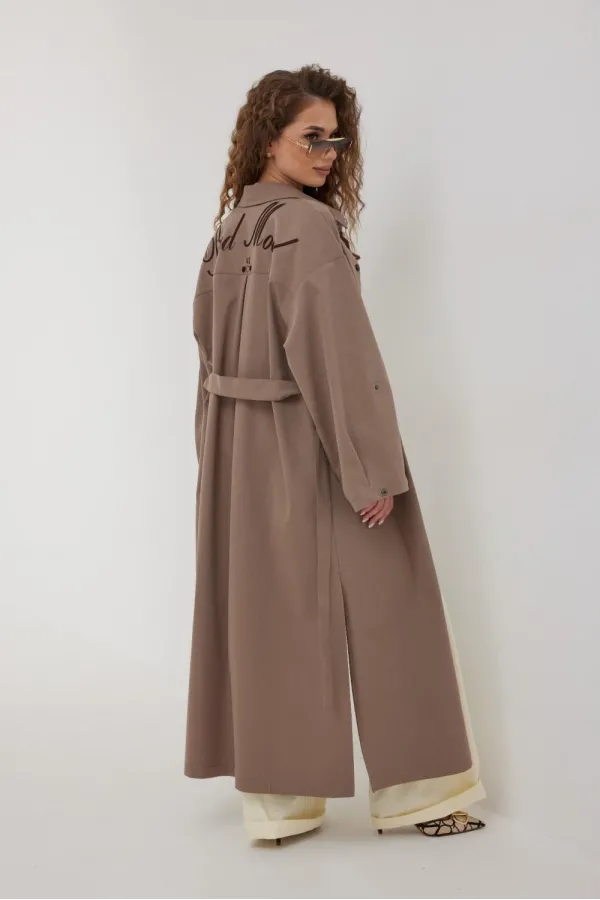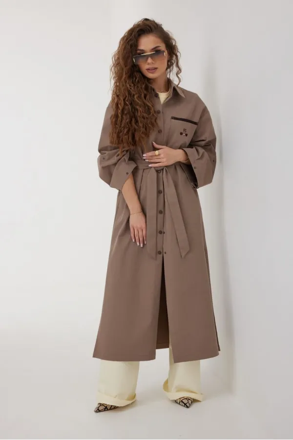Плащ женский, свободного силуэта без подкладки. Воротник отложного типа. Рукав широкий спущенный с патой. В боковых швах карманы и высокие разрезы. Застежка на кнопки. По левой части переда накладной карман с вышивкой.