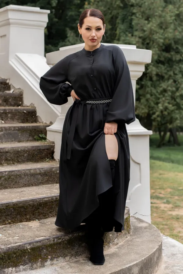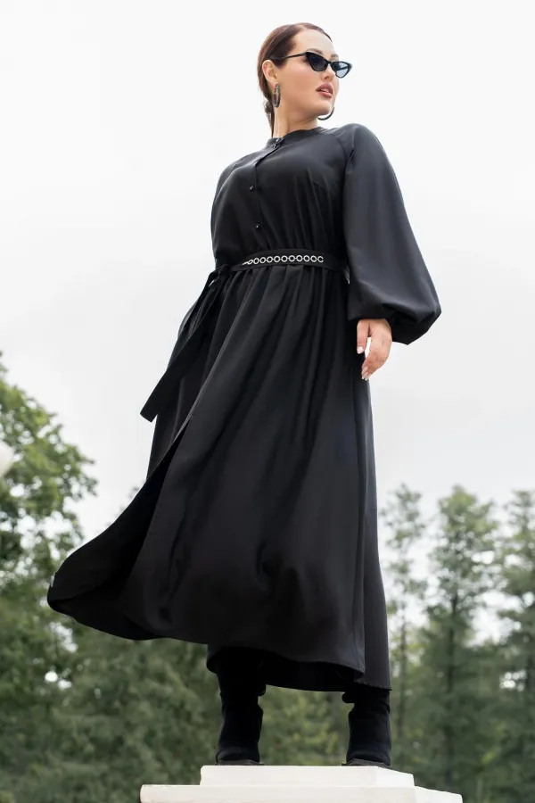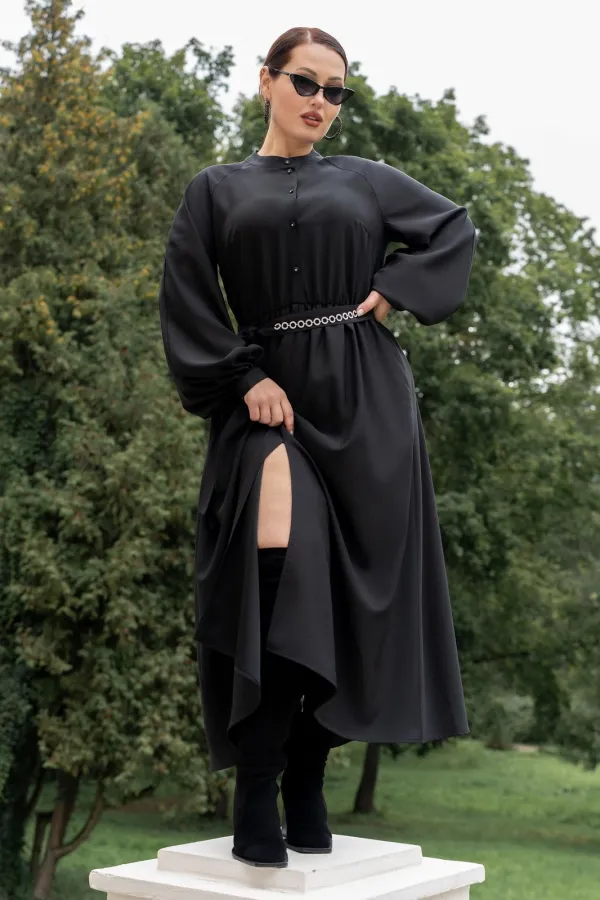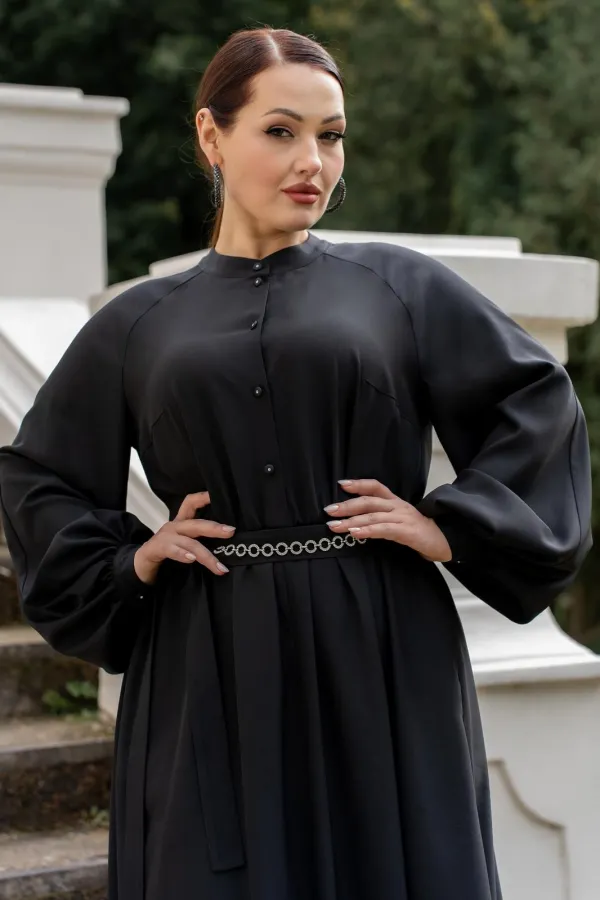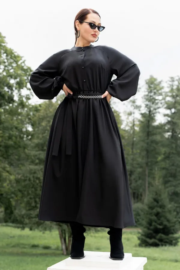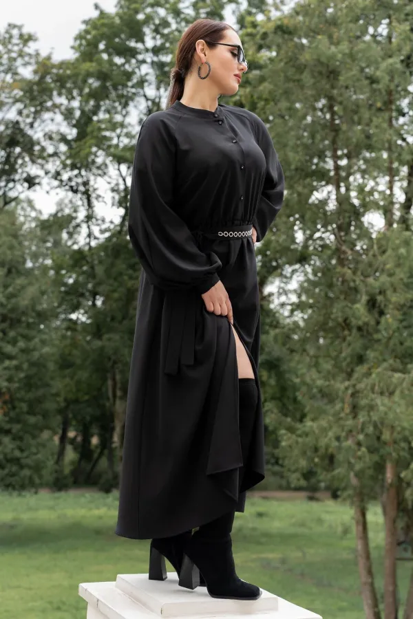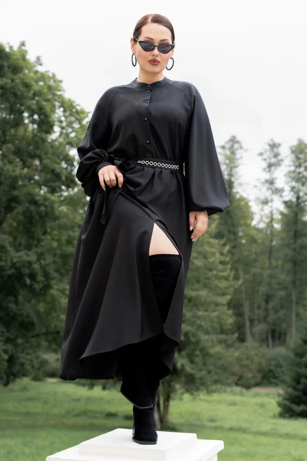 Платье женское полуприталенного силуэта с притачной юбкой со сборкой по талии с эластичной резинкой, с круглым вырезом горловины со стойкой, застёгивающейся на петлю и пуговицу, с центральной застёжкой на петли и пуговицы до подреза по талии, с рукавами реглан, по низу с притачными манжетами застёгивающиеся на петлю и пуговицу. По центру юбки обработан разрез.В боковых швах обработаны карманы. Рукава с притачными манжетами, со сборкой по низу рукавов. Платье со съёмным поясом с декором.