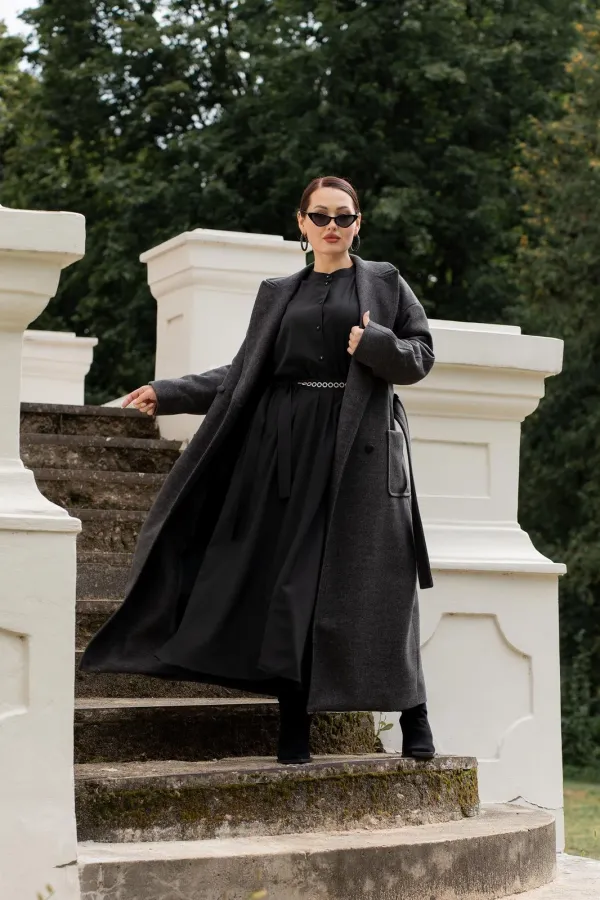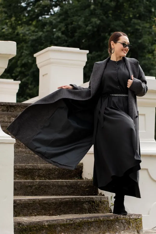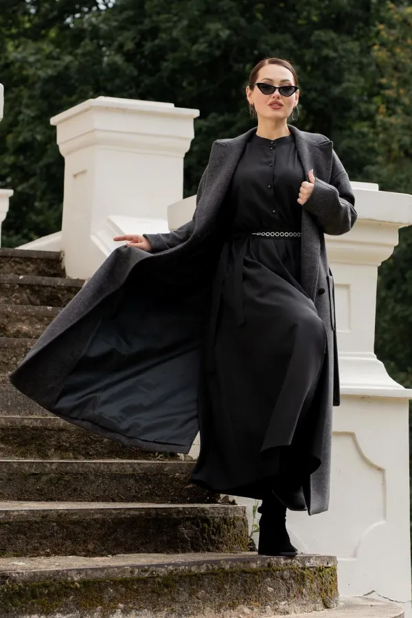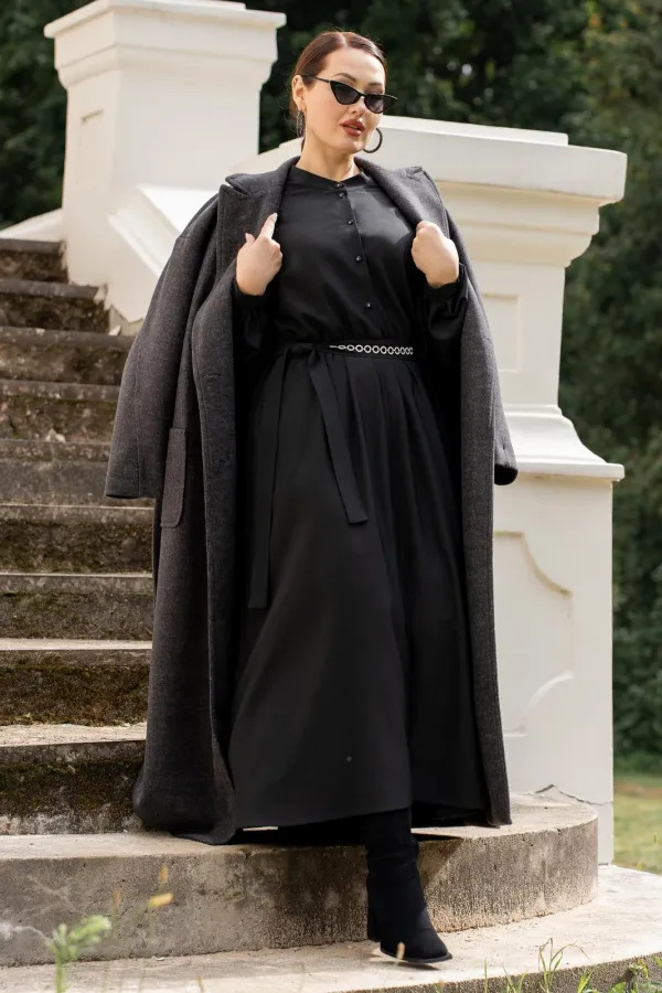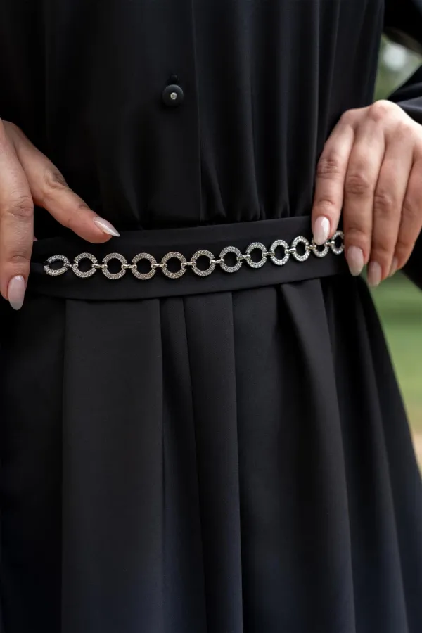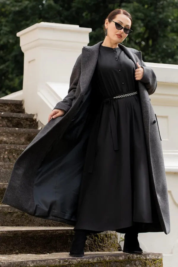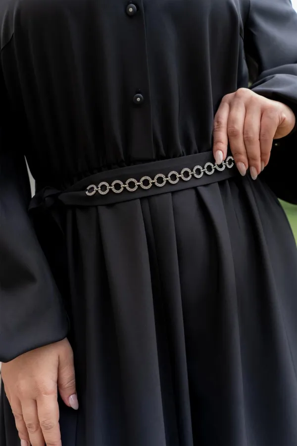 Платье женское полуприталенного силуэта с притачной юбкой со сборкой по талии с эластичной резинкой, с круглым вырезом горловины со стойкой, застёгивающейся на петлю и пуговицу, с центральной застёжкой на петли и пуговицы до подреза по талии, с рукавами реглан, по низу с притачными манжетами застёгивающиеся на петлю и пуговицу. По центру юбки обработан разрез.В боковых швах обработаны карманы. Рукава с притачными манжетами, со сборкой по низу рукавов. Платье со съёмным поясом с декором.
