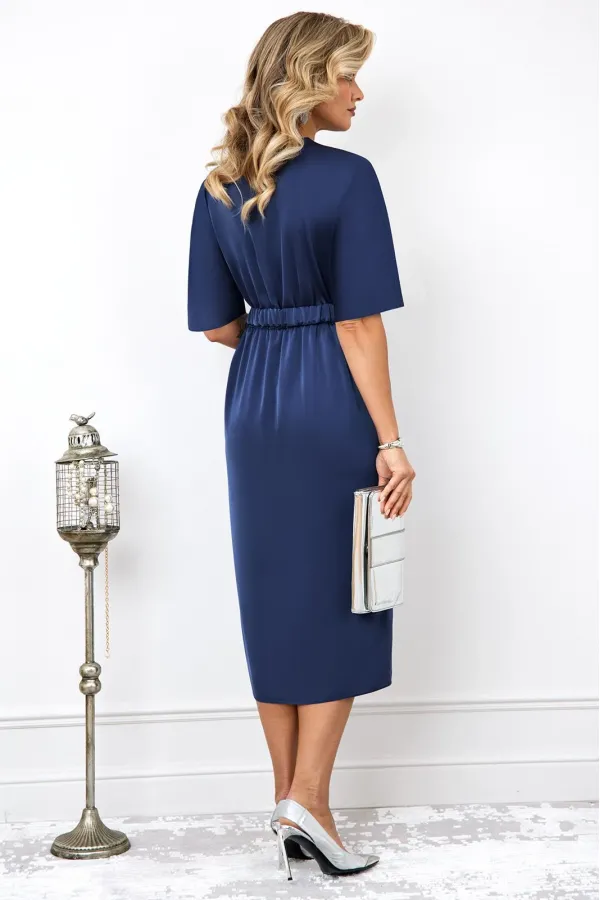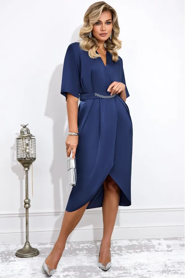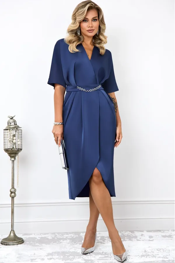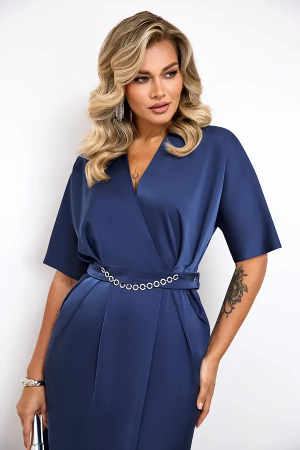 Элегантное нарядное платье, выполнено из роскошной струящейся плательной ткани с добавлением вискозы. Платье с имитацией запаха по переду, отрезное по линии талии. В боковом шве платья потайная молния застежка. Рукав цельнокроеный, спущенный, длиной до локтя. Спинка платья отрезная по талии, с резинкой. В комплекте идет съемный пояс, декорированный пришивным украшением, с резинкой и застежкой на пуговицы в цвет платья. Модель удобная и практичная, вы будете в нем выглядеть неотразимо и нарядно.