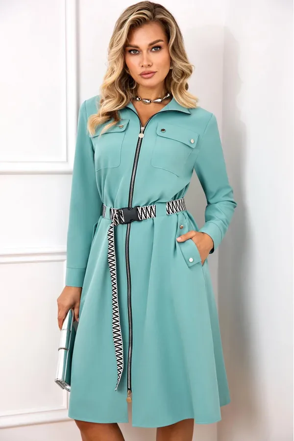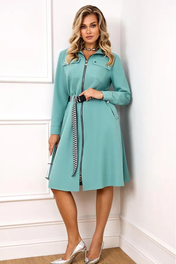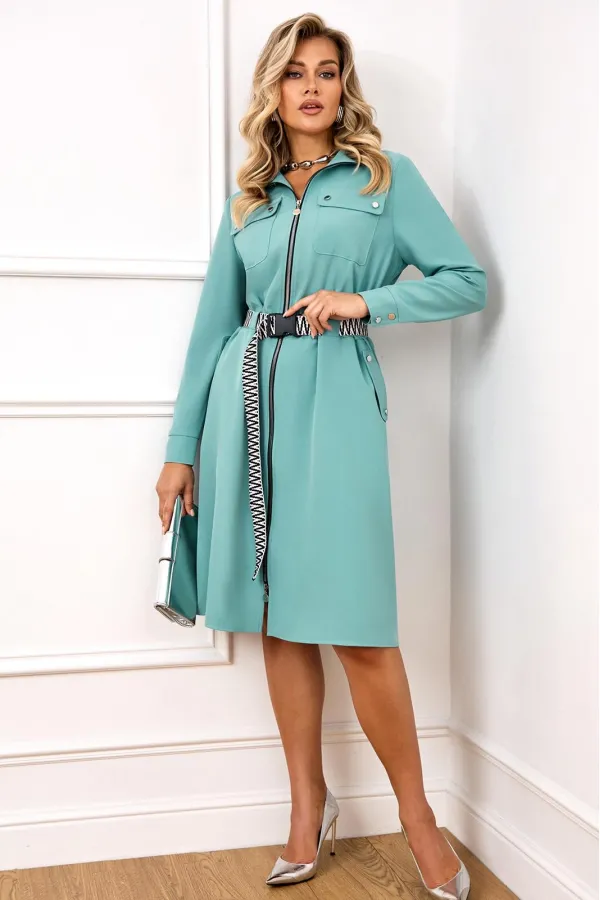 Стильное и элегантное платье выполнено из высококачественной плательной ткани с добавлением хлопка и вискозы. Платье по переду с застежкой на молнию (100 см), накладными карманами и декорировано пришивными пуговицами. По талии платье декорировано съемным поясом (тесьма может отличаться от той, что указана на фотографии) с пряжкой-застежкой и резинкой, что придет модели особый шарм. Рукав платья втачной, с манжетой и застежкой на две пуговицы. Горловина платья с воротником стойкой. Платье без подкладки. Модель стильная и практичная, прекрасно дополнит ваш гардероб, вы будете выглядеть неотразимо.