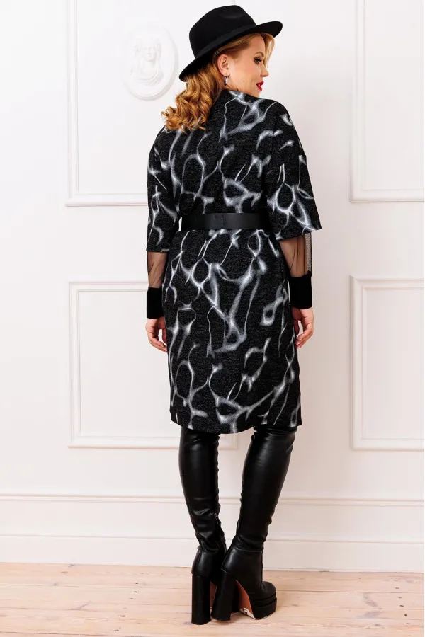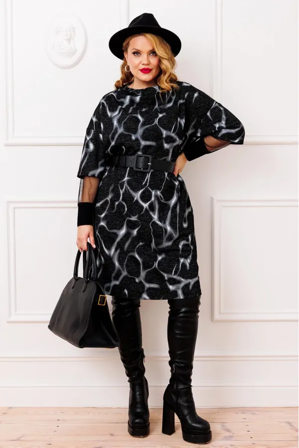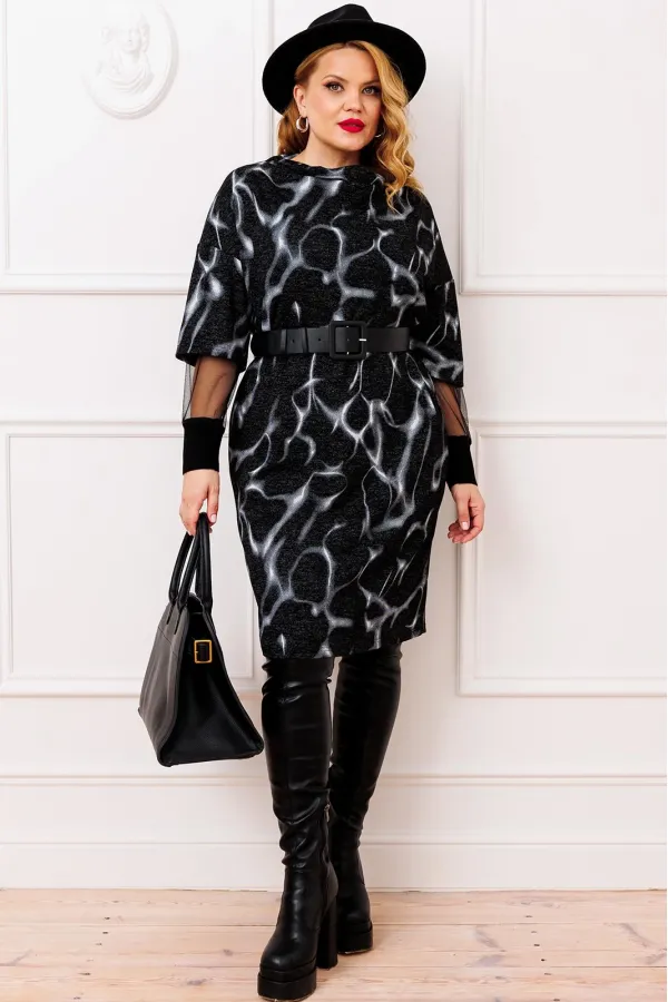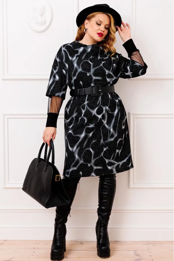 Стильное женское платье прямого силуэта, выполнено из высококачественной трикотажной ткани с модным дизайнерским принтом (ткань мягкая, приятная к телу, хорошо тянется). Горловина хомут, рукав спущенный, с отделкой из сетки с манжетой из трикотажного довяза, в боковых швах функциональные карманы. В комплекте идет съемный кожаный пояс. Модель стильная и практичная, невероятно стройнит, прекрасно подойдет для ежедневной носки, вы будете выглядеть неотразимо.