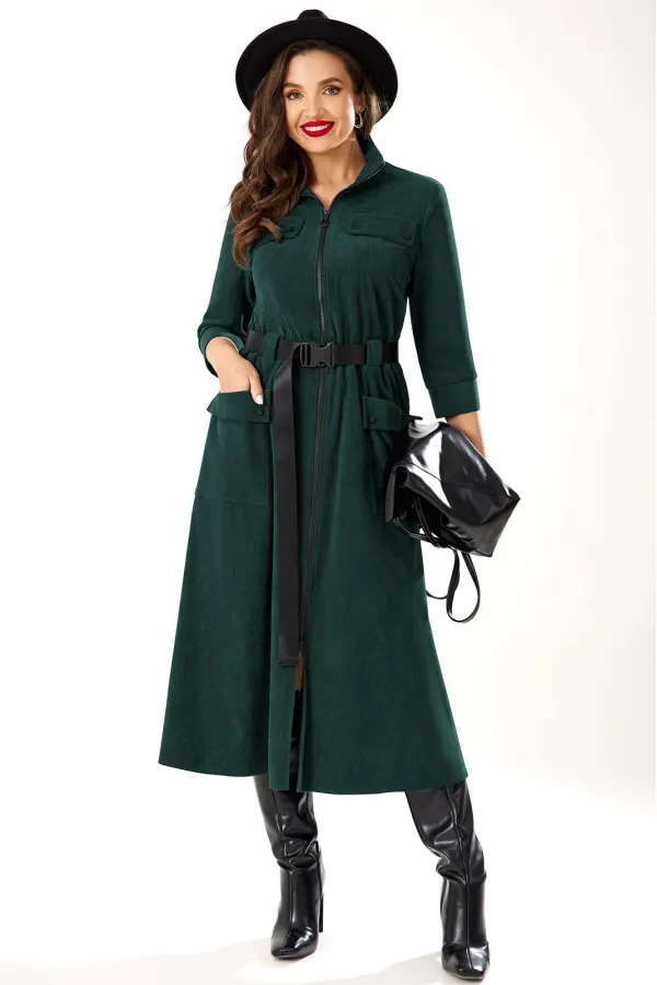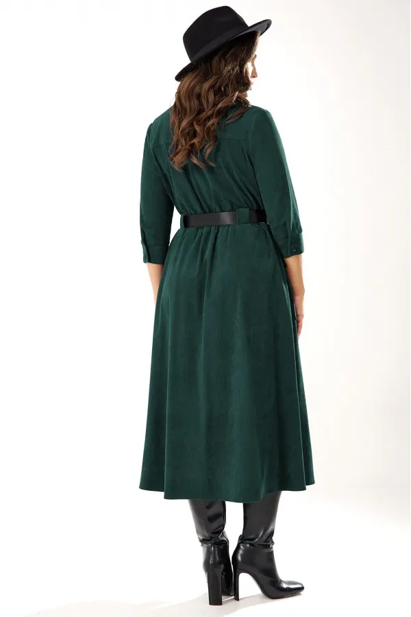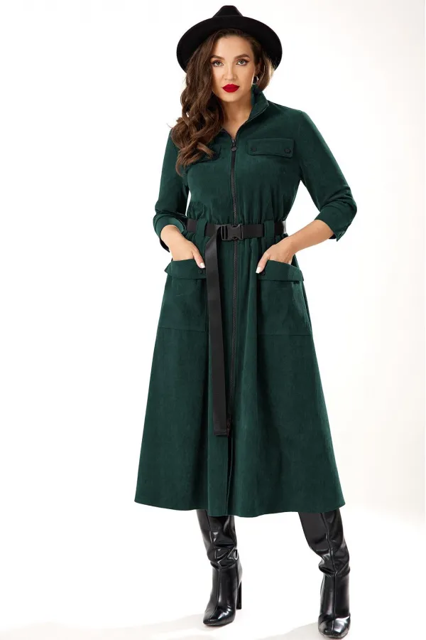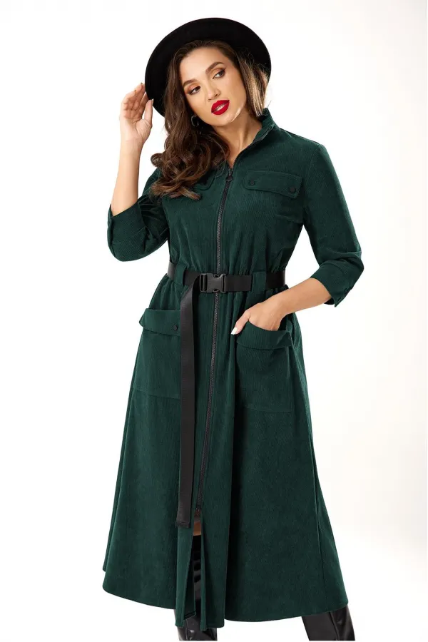 Стильное и элегантное платье выполнено из высококачественной ткани Вельвет. Платье по переду с застежкой на молнию (100 см), накладными карманами и декорировано пришивными пуговицами. По талии платье декорировано съемным поясом с пряжкой-застежкой и резинкой, что придет модели особый шарм. Рукав платья втачной, с манжетой и застежкой на две пуговицы. Горловина платья с воротником стойкой. Платье без подкладки.