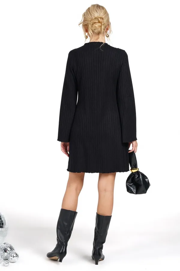 Платье полуприлегающего силуэта вверху с расширением книзу, с цельнокроеной стойкой, с втачными, одношовными, длинными рукавами книзу расширенные. Горловина, низ изделия и рукава обработаны узкой краеобмёточной строчкой «флешь».