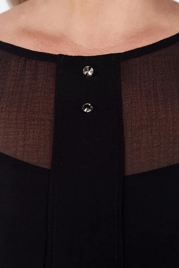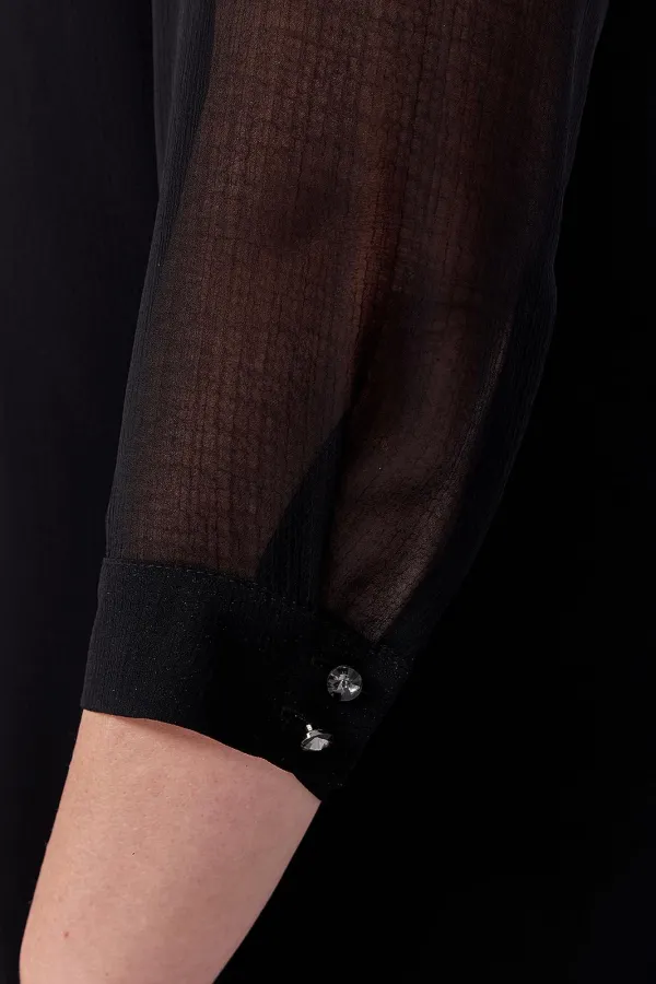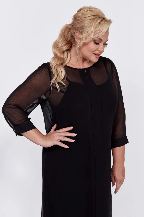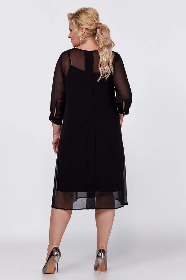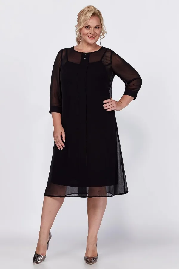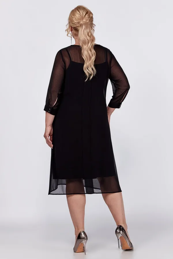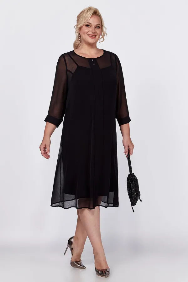 Универсальное, элегантное черное платье с рукавом длиной ¾ на манжете и отдельным подкладом поможет Вам в создании абсолютно разных образов. Платье имеет классический прямой крой с бантовыми складками по переду и по спинке, которые добавляют романтичность и элегантность. Платье подойдет как высоким, так и невысоким женщинам, благодаря своей миди длине. Верхнее платье выполнено из шифона, горловина декорирована пуговицами. Нижнее платье на бретелях пошито из ткани масло. Это платье Вы можете легко использовать как платье вечернее, как платье для прогулки или на свидание, на день рождения или клуб, для фотосессии или романтического вечера.