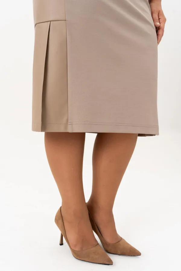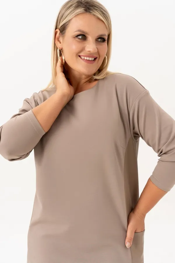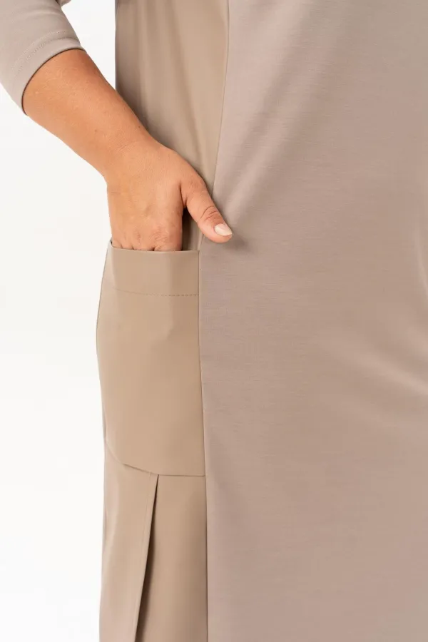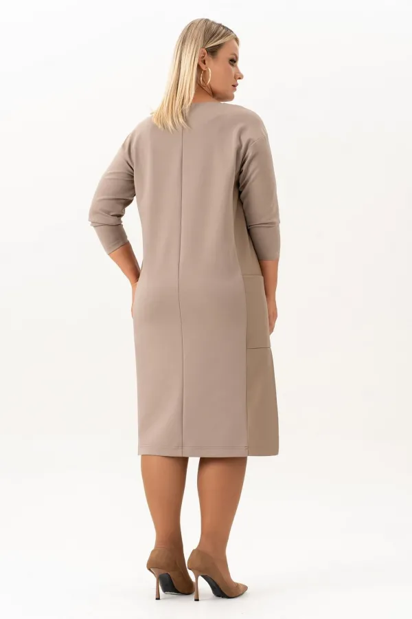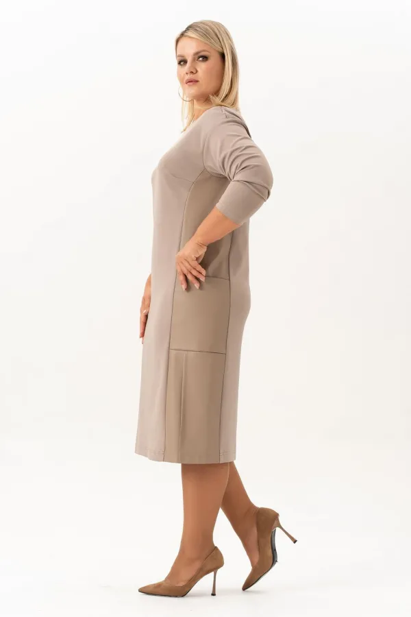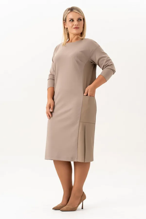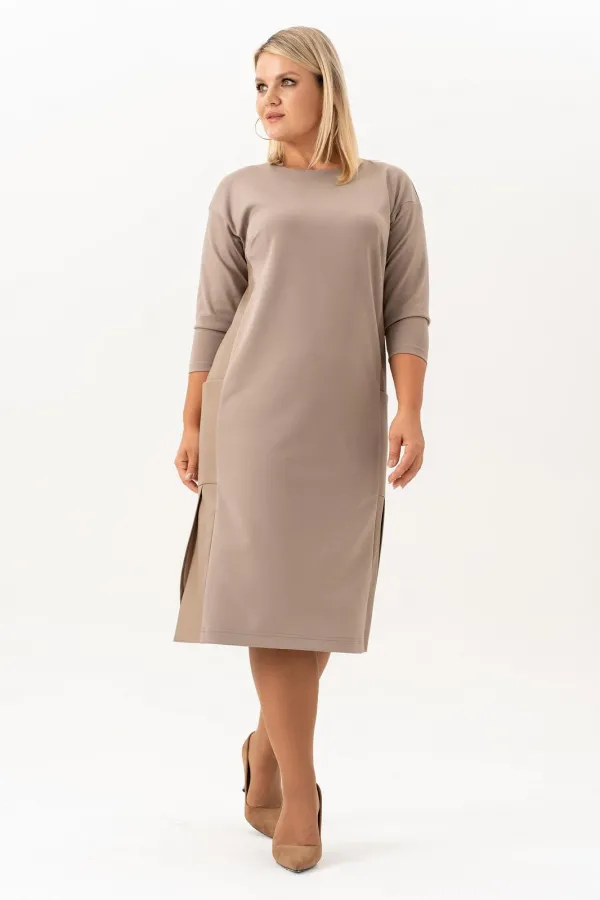 Базовое женское платье прямого кроя больших размеров - это идеальный выбор для создания стильного образа. Трикотажное платье подойдет как для повседневного использования, так и для офиса. Цвет нежного капучино придает глубину и загадочность образу, позволяя легко переходить от дневного к вечернему стилю. Кроме того, модель сочетается с любыми аксессуарами и обувью, что делает его универсальной базой гардероба. Строгий при этом простой и лаконичный дизайн делает его достаточно универсальным, чтобы подходить практически любому типу фигуры. Длинные рукава создают эффектную линию, а удлиненный крой придает ей свободный и стильный вид. Эффектная модель платья идеальный выбор для женщин с пышными формами, которые хотят выглядеть стильно и элегантно. Однотонное платье со спущенным плечом, свободная посадка прямого кроя и приятная немнущаяся ткань идеально садится на большие размеры . Вставка из ткани экокожи добавляет модного акцента. Прямой крой корректирует силуэт визуально делая женскую фигуру более стройной, а длина миди ниже колена позволит скрыть недостатки и фигура приобретет более подтянутый вид. На боковых швах обработаны накладные карманы и разрезы. Платье подчеркнет вашу индивидуальность и станет ярким акцентом в вашем образе.