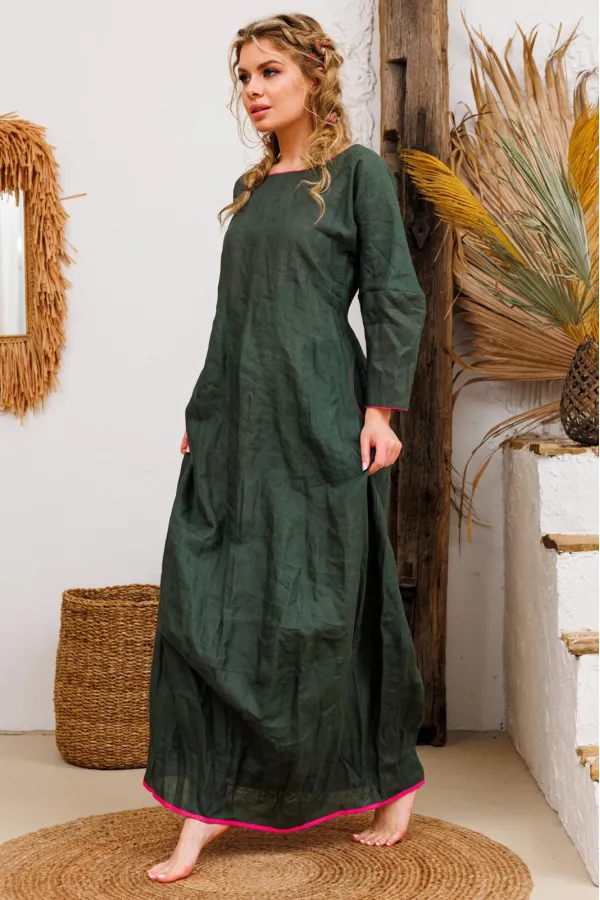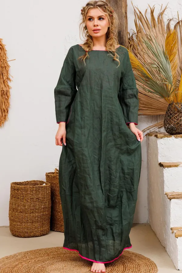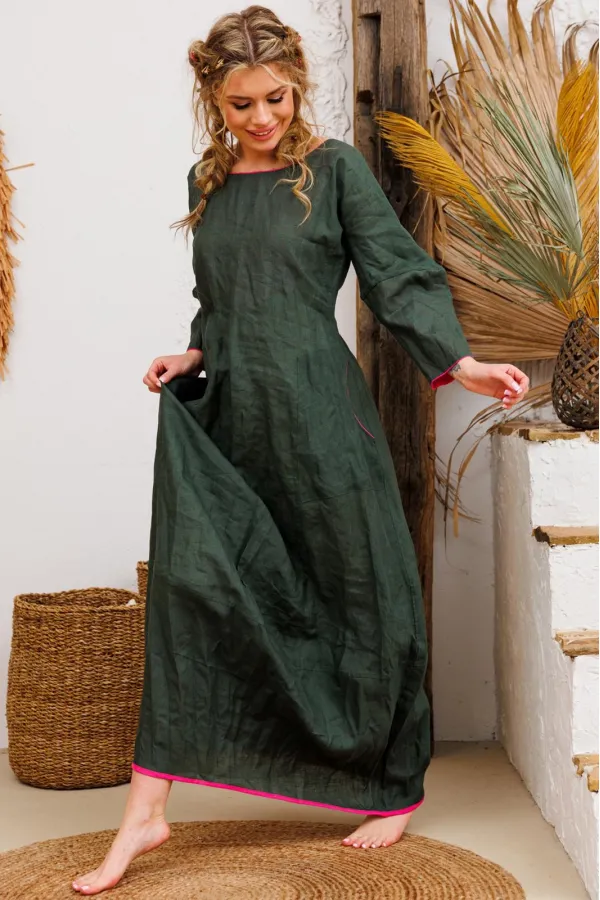 Натуральное льняное шикарное платье со смыслом. Это платье уникально и восхищает своим сочетанием цветов. Тёмно-зелёный с фуксией, это правда удивительно красиво. А силуэт который создается таким изысканным кроем получа... Читать далее...