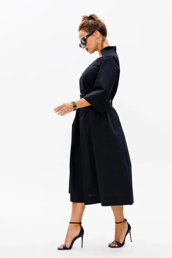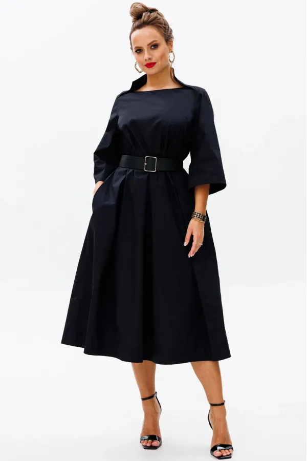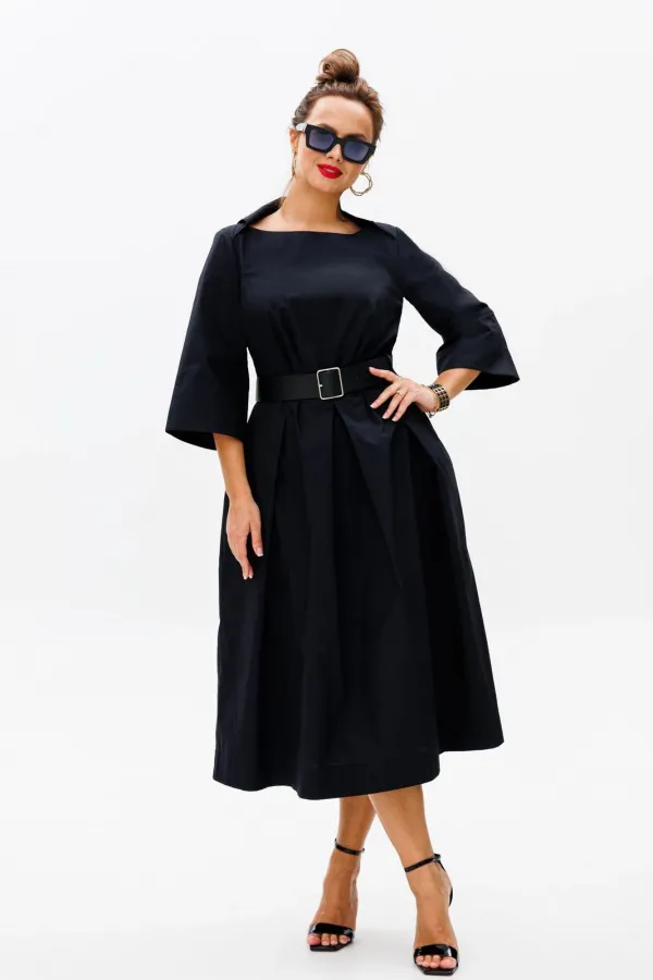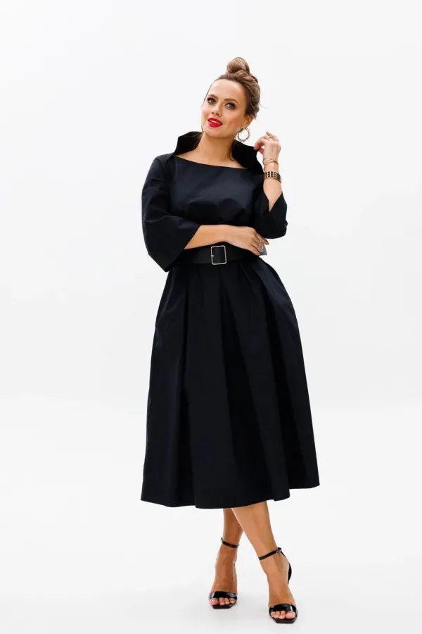 Шикарное черное платье с поясом ремнем. Идеально на любую погоду: под босоноржки либо под сапоги и пальто. Отличный вариант универсального изделия: подойдет как для повседневного и офисного гардероба, так и для праздничного выхода. Отрезное по линии талии. По полочке объем груди создается за счет направленных складок из подреза. Объем юбки создается за счет центральной встречной и 2-х односторонних складок. По бокам в юбке- карманы. Рукав втачной, 3/4 длинны с отворотом. Вырез горловины лодочка с отложным воротником. В комплекте съемный пояс. Длина спинки до подреза -45 см., длина юбки -77см. Длина рукава-44 см.