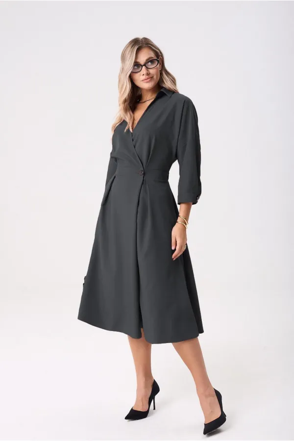 Элегантное женское палтье из костюмной ткани необычного кроя станет изюминкой вашего гардероба. Платье полуприлегающего силуэта, отрезное по линии талии со спущенным плечом. Рукав 3/4 длиный на отрезной манжете. По полочке идут защипы-складки в верхней и нижней частях, запах - на петли и пуговицы по подрезу. По нижней части платья запах идет в виде складки. По спинке кокетка со складкой, по подрезу вставлена резинка. Юбка-полусолнце с односторонними складками по полочке, по бокам карманы. По горловине воротник на отрезной стойке. Платье будет идеально смотреться с туфлями, ботинкаи и сапогами. Длина по спинке: 117см. Длина рукава с манжето 29см.