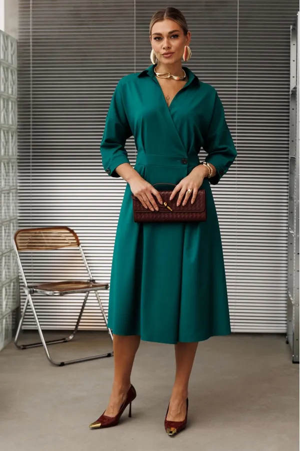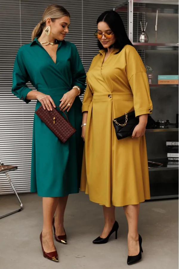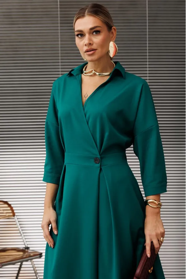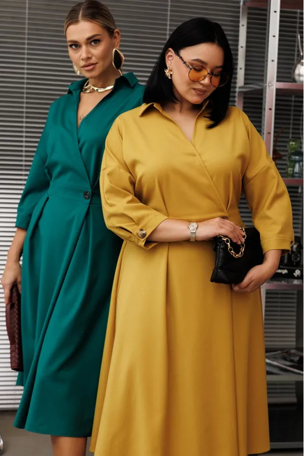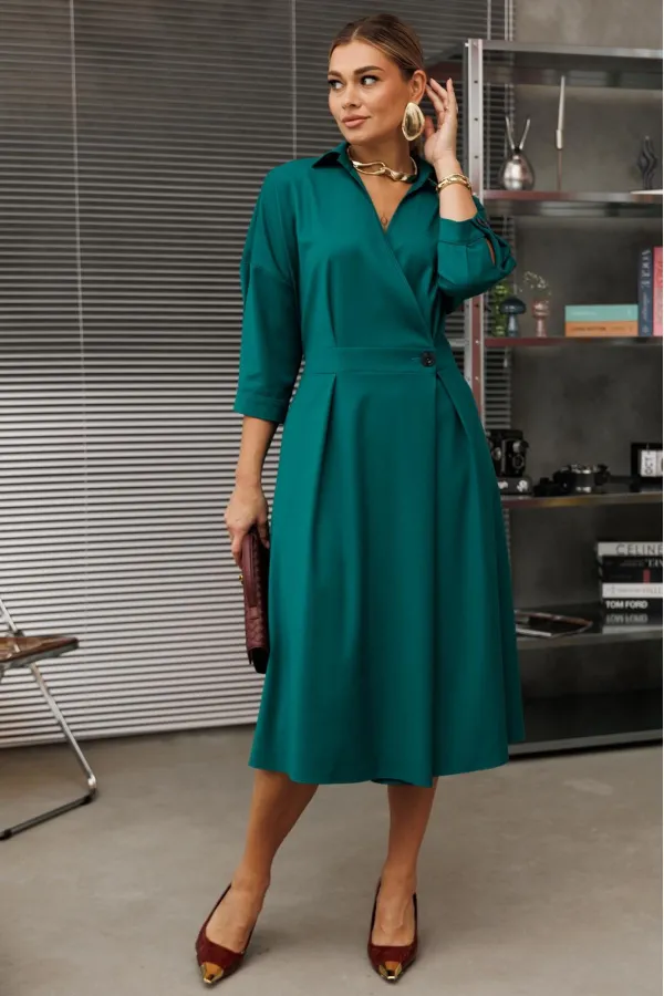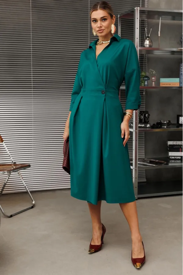 Элегантное женское палтье  из костюмной ткани необычного кроя станет изюминкой вашего гардероба.  Платье полуприлегающего силуэта, отрезное по линии талии со спущенным плечом. Рукав 3/4 длиный на отрезной манжете.  По полочке идут защипы-складки в верхней и нижней частях, запах - на петли и пуговицы по подрезу. По нижней части платья запах идет в виде складки.  По спинке кокетка со складкой, по подрезу вставлена резинка.  Юбка-полусолнце с односторонними  складками по полочке, по бокам карманы. По горловине воротник на отрезной стойке. Платье будет идеально смотреться с туфлями, ботинками и сапогами. Длина по спинке: 117 см. Длина рукава с манжетой 29 см.