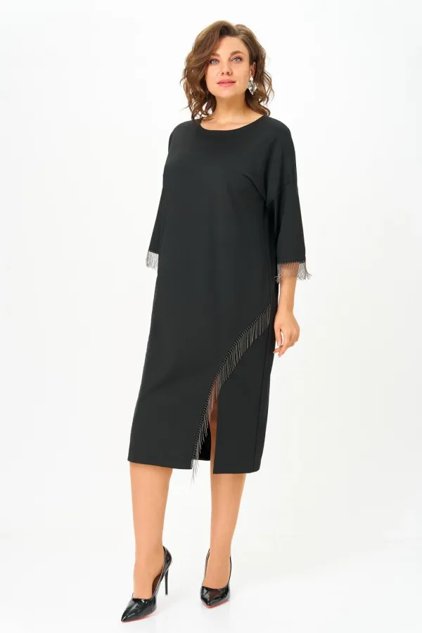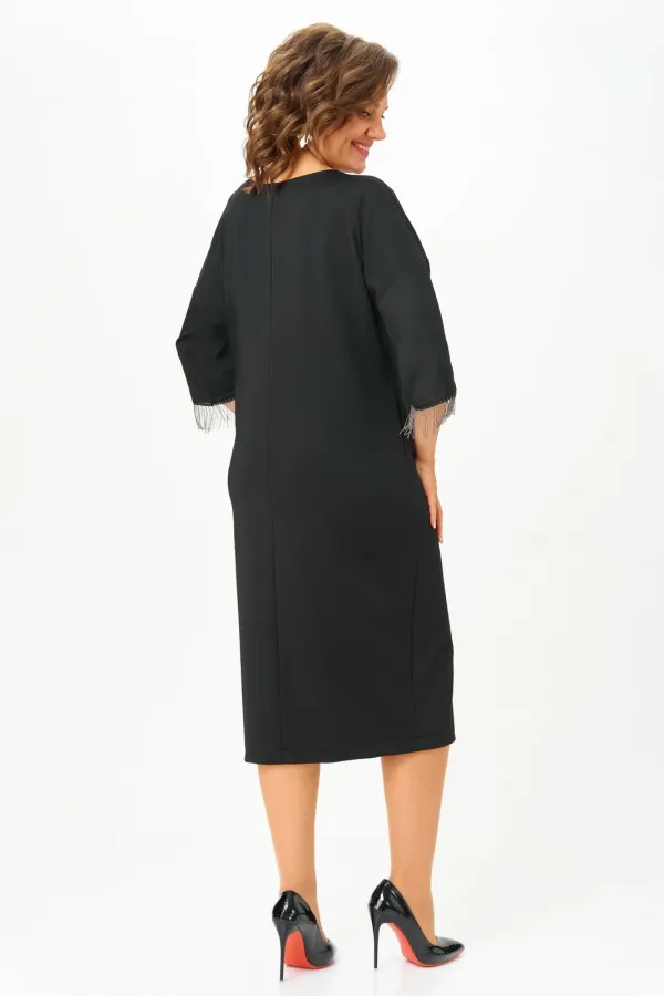 Черное платье миди — не просто одежда, это заявление о вашем стиле и вкусе. Элегантное праздничное платье прямного силуэта из трикотажного полотна. Ткань не мнется. Благодаря своему крою подойдёт для разных типов фигуры. Оно подчеркнёт вашу индивидуальность и станет отличным дополнением к вашему гардеробу. В нём вы будете чувствовать себя уверенно и комфортно, зная, что выглядите на все сто. Выбирая его, вы выбираете качество, комфорт и стиль. Классическое черное платье прямого силуэта, со спущенным плечом. По переду идет подрез с разрезом. В качестве декора по подрезу и низу рукава- металлизированная бахрома. По спинке идет средний шов. Такое платье незаменимая вещь в любом гардеробе. Рекомендуется носить на черное белье. Длина платья по спинке (48-52) - 108см, (54-58) - 112 см. Длина рукава: (48-58) - 24 см.
