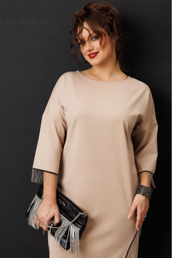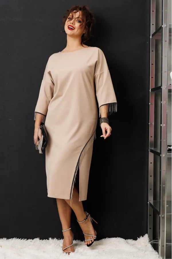 Черное платье миди — не просто одежда, это заявление о вашем стиле и вкусе. Элегантное праздничное платье прямного силуэта из трикотажного полотна. Ткань не мнется. Благодаря своему крою подойдёт для разных типов фигуры. Оно подчеркнёт вашу индивидуальность и станет отличным дополнением к вашему гардеробу. В нём вы будете чувствовать себя уверенно и комфортно, зная, что выглядите на все сто. Выбирая его, вы выбираете качество, комфорт и стиль. Классическое черное платье прямого силуэта, со спущенным плечом. По переду идет подрез с разрезом. В качестве декора по подрезу и низу рукава- металлизированная бахрома. По спинке идет средний шов. Такое платье незаменимая вещь в любом гардеробе. Рекомендуется носить на черное белье. Длина платья по спинке (48-52) - 108см, (54-58) - 112 см. Длина рукава: (48-58) - 24 см.