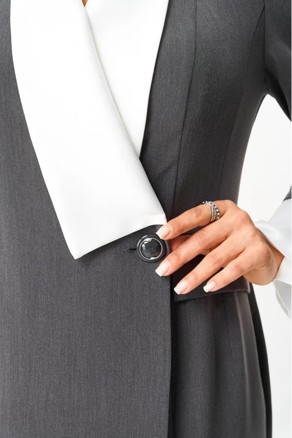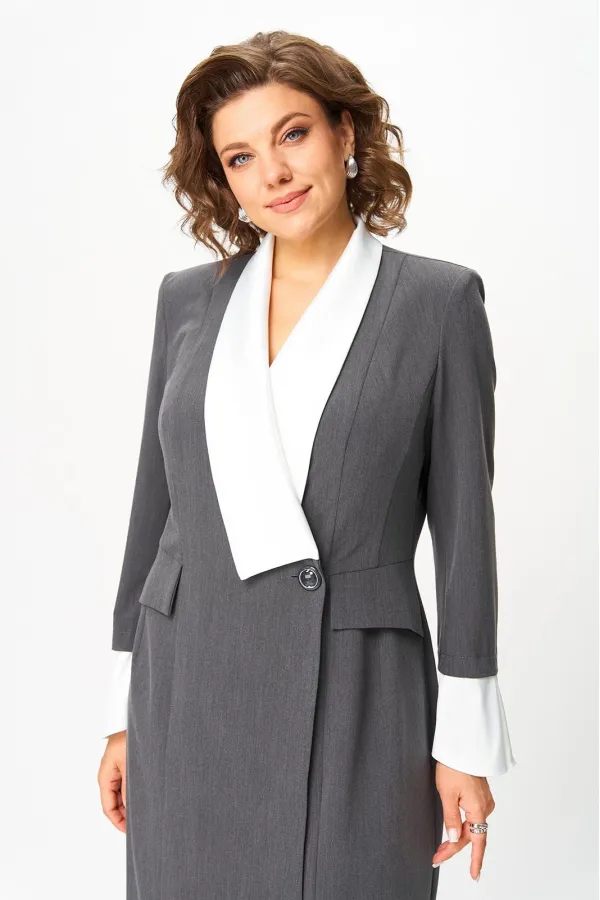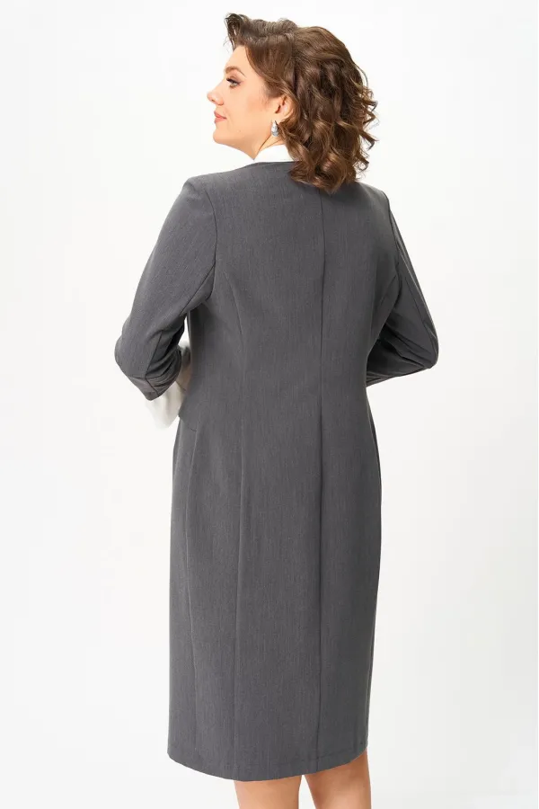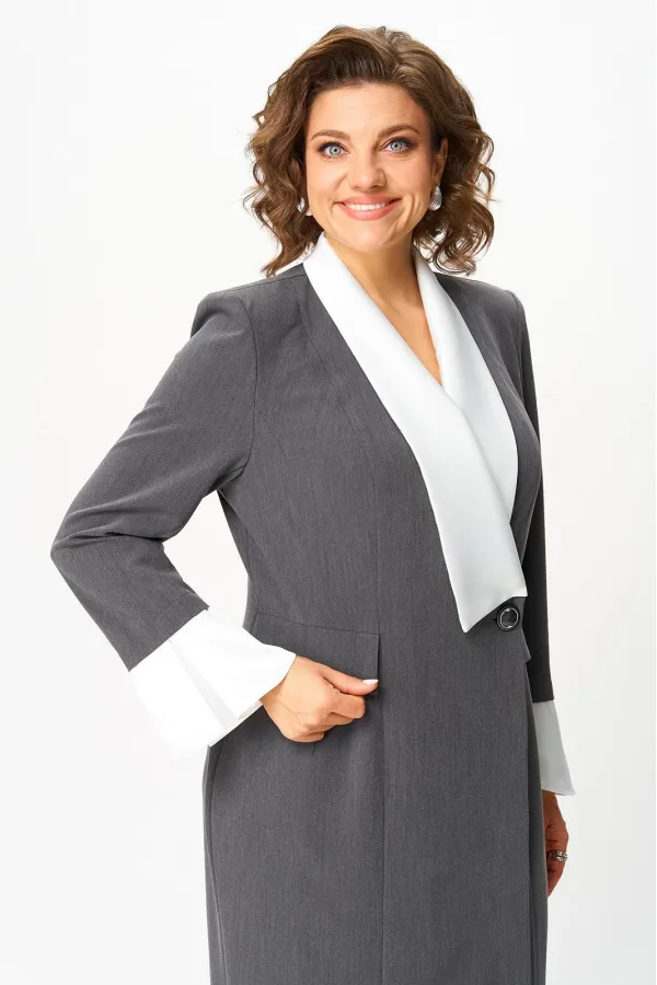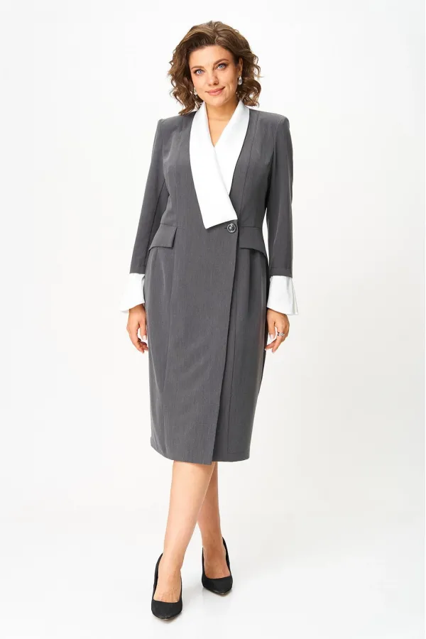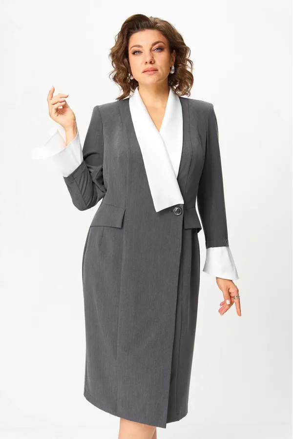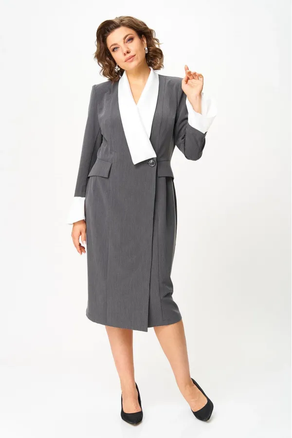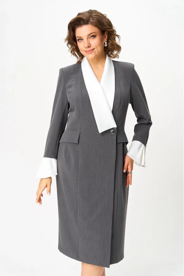 Полочка платья с вертикальными рельефами в верхней части и с отрезной боковой нижней частью с талиевой вытачкой и декоративным клапаном. Застежка двубортная, на петлю и пуговицу. Горловина V-образной формы, обработана воротником типа “апаш” из отделочной ткани. Спинка со средним швом и вертикальными рельефами. Рукав длинный, втачной, двухшовный.