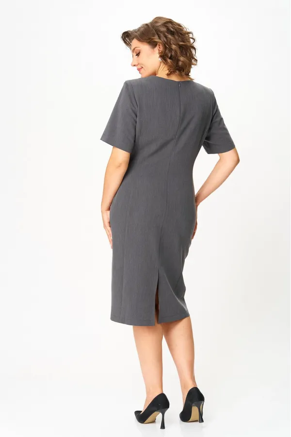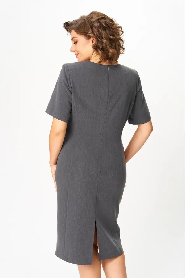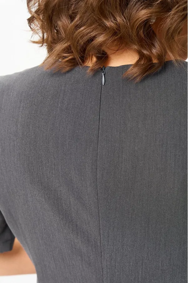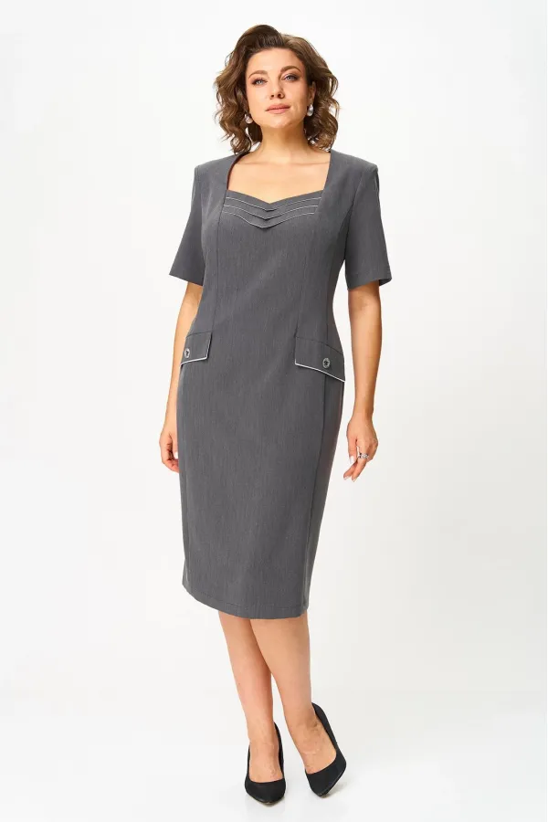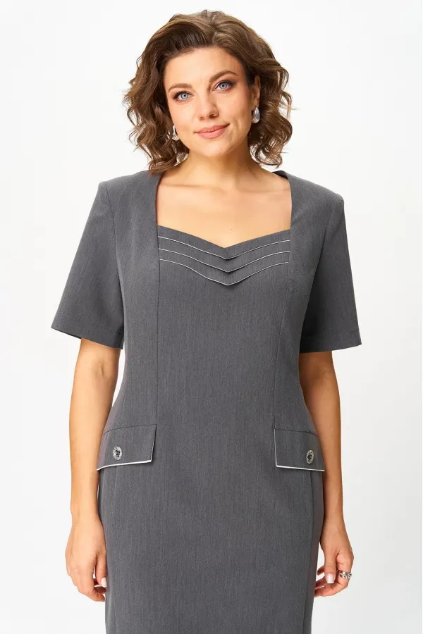 Полочка платья с вертикальными рельефами, горловина формы “каре”с декором в виде планок с отделкой. Ниже линии талии обработаны декоративные клапаны с отделкой и пуговицами. Спинка со средним швом, в нижней части которого обработан разрез, в верхней части потайная молния. Рукав длиной до локтя , одношовный, втачной.Параметры изделия представлены на фото.
