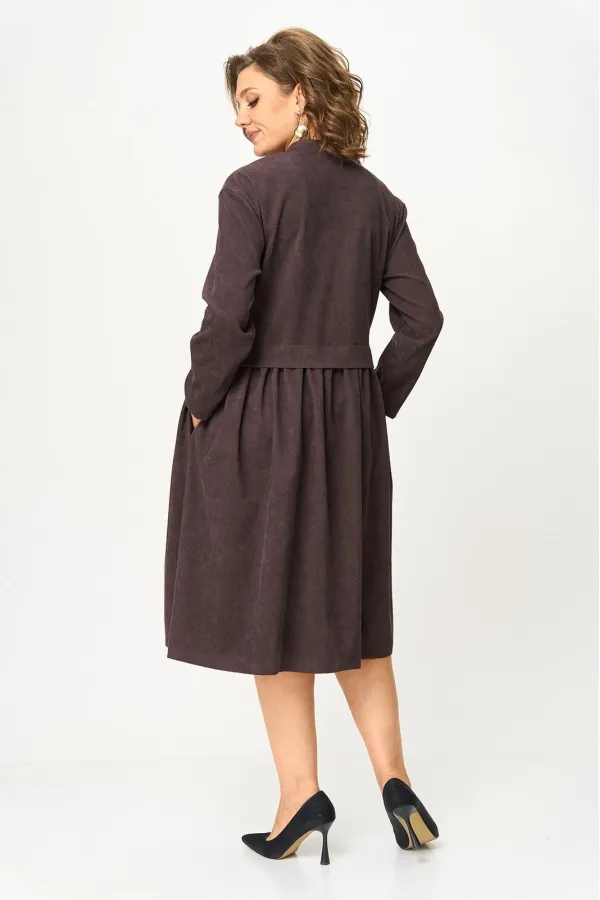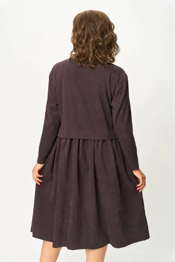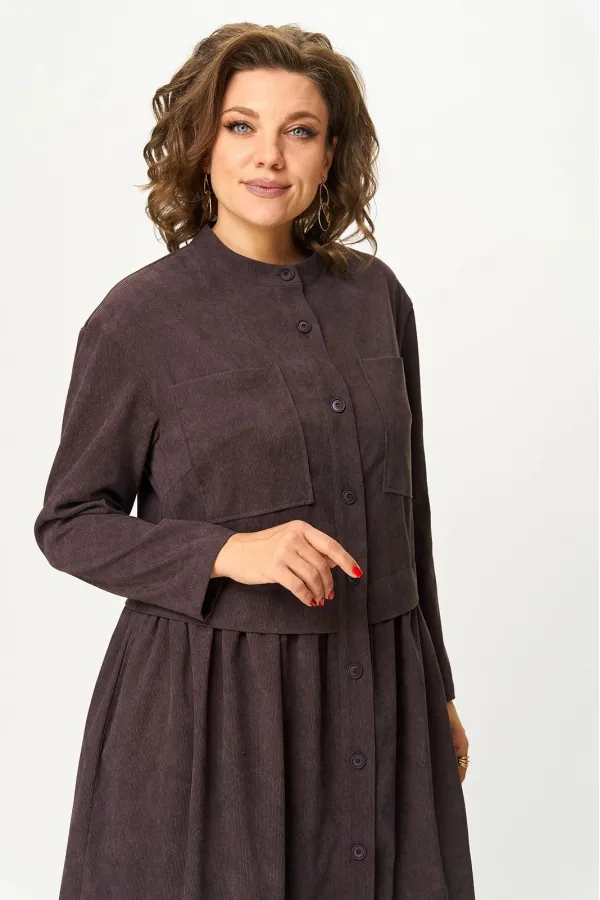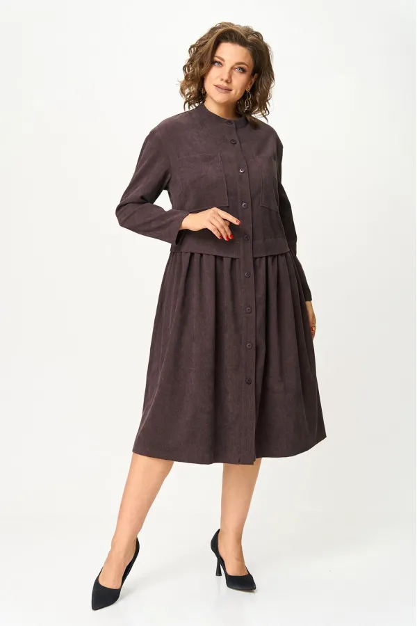 Платье прямого силуэта, длиной за колено, выполнено из вельвета в мелкий рубчик. Полочка платья с отрезной планкой по центру и застежкой на петли и пуговицы. Лиф платья отрезной , со складкой по низу, к срезу которой притачана юбка со сборкой. Полочка лифа с нагрудными вытачками и накладными карманами. Горловина круглой формы обработана воротником-стойкой. Пройма углубленной формы с рукавом рубашечного типа, рукав длинный, одношовный. В боковых швах юбки обработаны карманы.