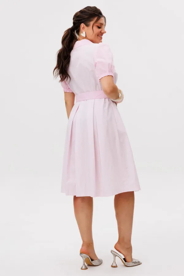 Нижняя часть платья с двумя встречными складками по переду и спинке от линии талии создаёт красивое движение ткани при каждом шаге, добавляя образу воздушности и деликатного объёма. Хлопковая ткань в мелкую полоску выглядит свежо и утончённо, а детали из ткани-компаньона в такую же мелкую клеточку - втачной короткий рукав-фонарик, отложной воротник с лацканами и съёмный завязывающийся пояс - придают образу особое очарование и делают его по-настоящему выразительным.