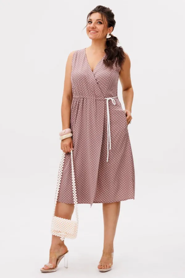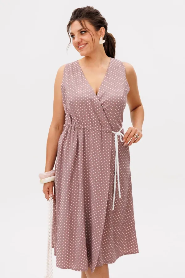 Длина ниже колена деликатно вытягивает силуэт, а конструкция на запах красиво адаптируется к любой фигуре, подчёркивая достоинства и создавая ощущение естественного комфорта. Нежная вискозная ткань мягко струится при движении, даря лёгкость и приятные тактильные ощущения, а актуальный горошковый принт в кремовом оттенке добавляет образу свежести и романтичного настроения. Пояс на кулиске позволяет регулировать посадку, создавая идеальный силуэт и ощущение свободы.