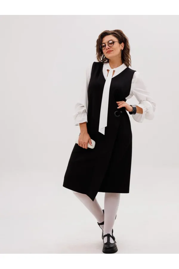 Этот сарафан, выдержанный в строгом прямом силуэте, становится идеальной основой для современного гардероба. Его лаконичную геометрию мягко нарушает игра асимметрии — динамичный, неровный край низа плавно скользит по фигуре, создавая ощущение движения и художественной небрежности. Глубокий V-образный вырез горловины не только зрительно вытягивает шею, но и привносит ноту женственности и открытости, служа идеальным фоном для любимой блузки или тонкого джемпера.