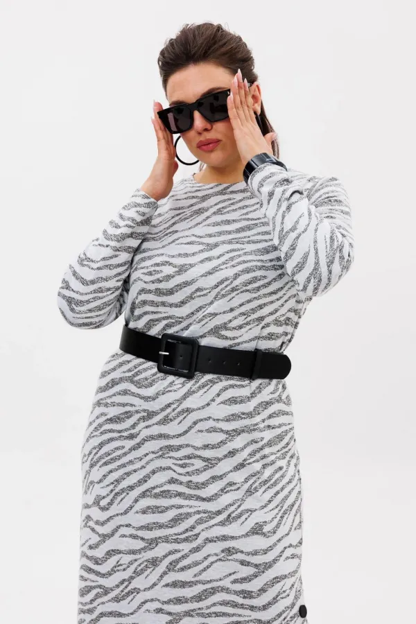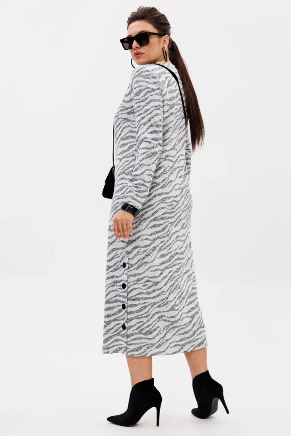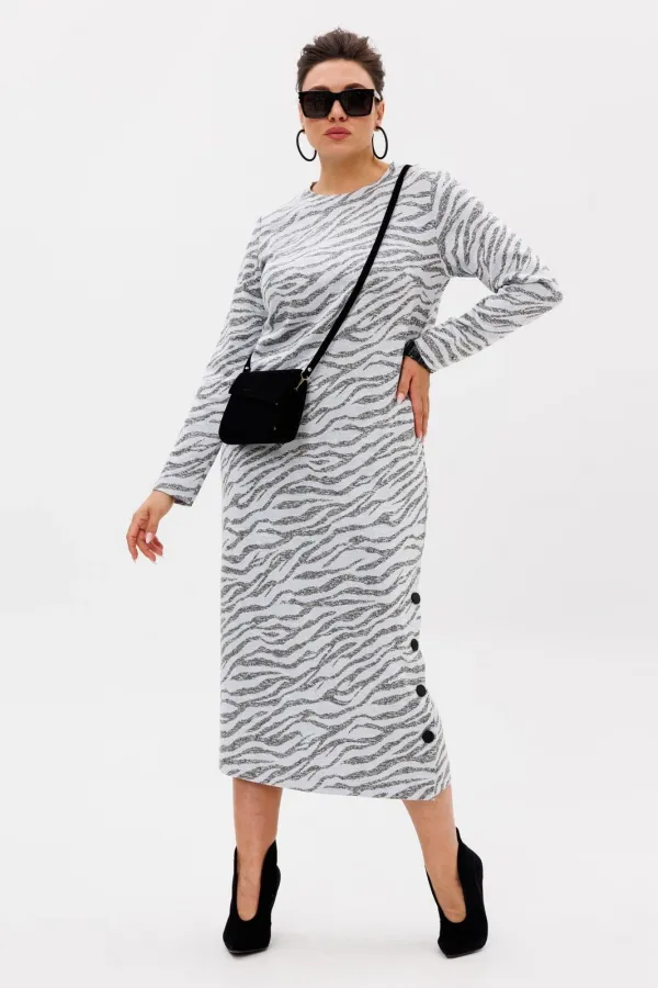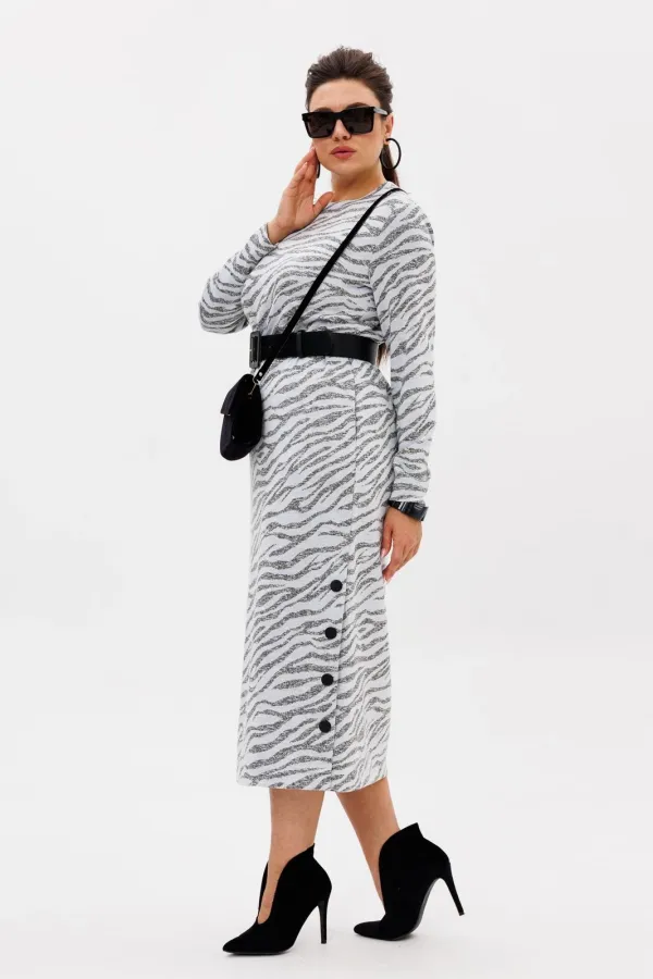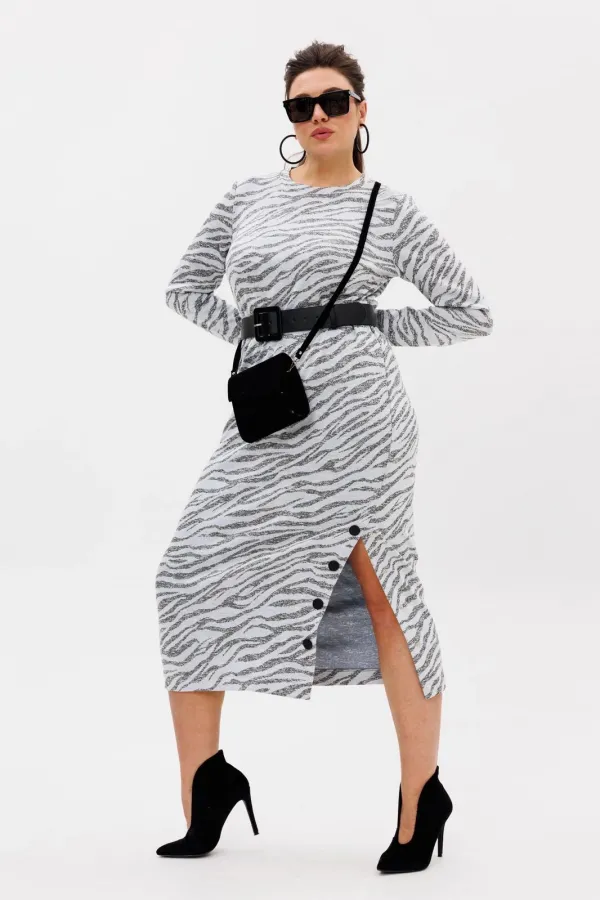 Особенность модели — стильная шлица на кнопках, расположенная сбоку, которая не только добавляет оригинальности, но и позволяет варьировать образ: расстегнув несколько кнопок, можно создать лёгкий, игривый акцент.