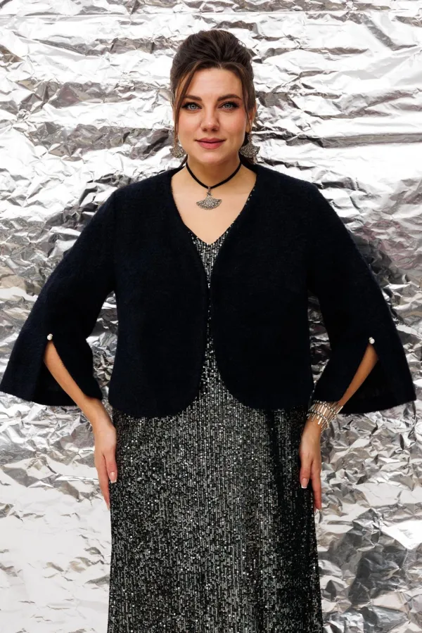 На моделе в платье цвета «плутоний» шикарное болеро 1445.Размер 50: ОГ-106; ОТ-108; ОБ-114; ДИ-96; ДР-35; ОП-36;