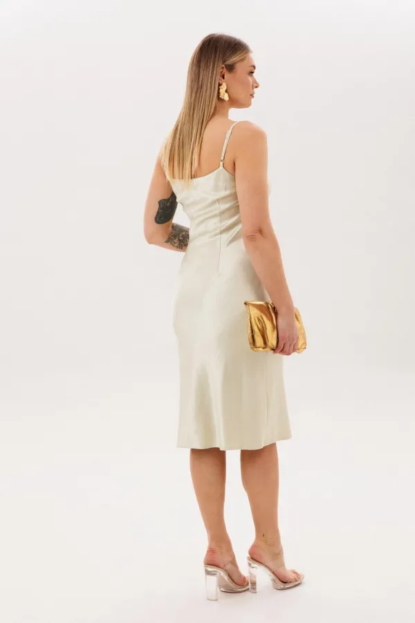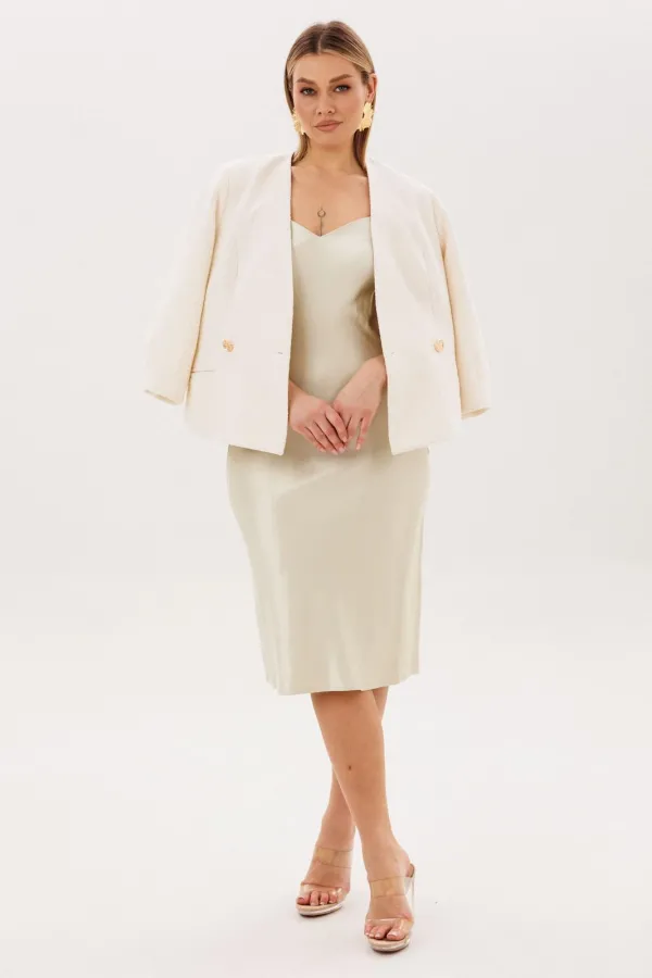 Легкая ткань в цвете «жемчужный нектар» мягко скользит по силуэту и деликатно переливается благородным сиянием с золотым оттенком, создавая ощущение утончённой роскоши и спокойной уверенности.
