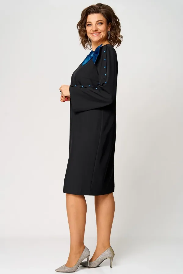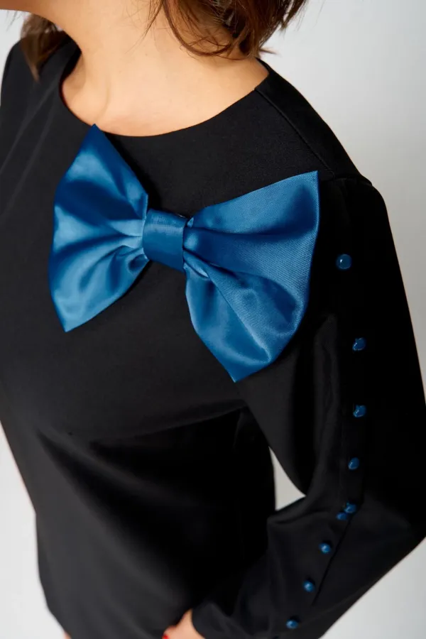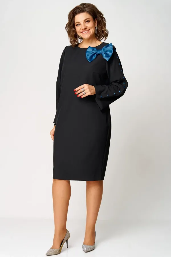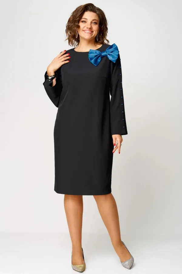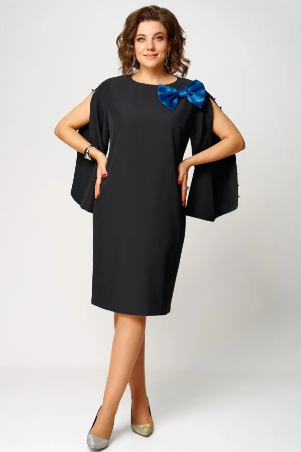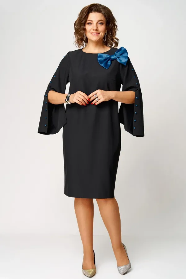 Платье женское полуприлегающего силуэта из костюмно-плательной ткани. Горловина округлой формы. Перед с нагрудными вытачками. Спинка с талиевыми вытачками, застежкой на молнию и разрезом в среднем шве. Рукав втачной прямой длинный с разрезом и декоративной застежкой на петли и пуговицы. По низу платья в боковом шве высокий разрез. Декорировано платье съемным бантом.