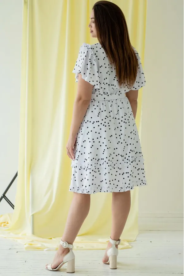 Платье женское отрезное по линии талии на резинке. Перёд с нагрудными вытачками. По спинке центральный шов. Рукава «крылышки» собраны по окату с притачной рюшей. Горловина фигурная на завязке. Украшает платье рюши по низу юбки. Платье без подкладки. Длина 102 см, рукав 19 см.