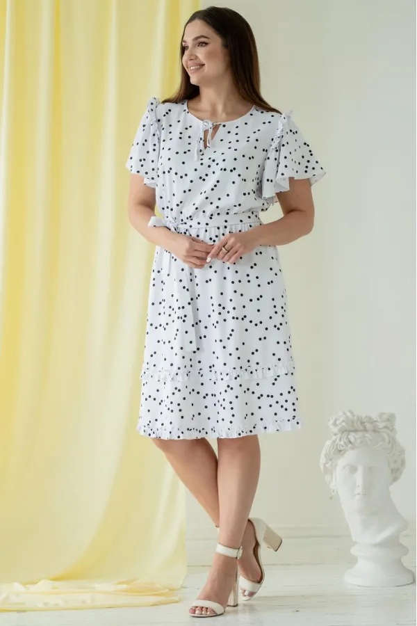 Платье женское отрезное по линии талии на резинке. Перёд с нагрудными вытачками. По спинке центральный шов. Рукава «крылышки» собраны по окату с притачной рюшей. Горловина фигурная на завязке. Украшает платье рюши по ни... Читать далее...