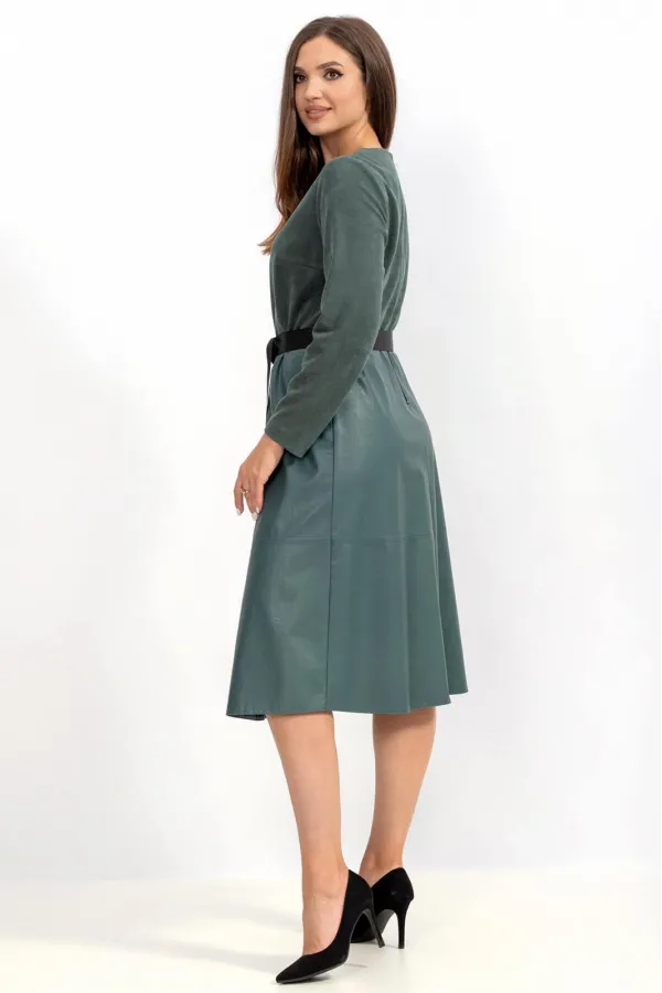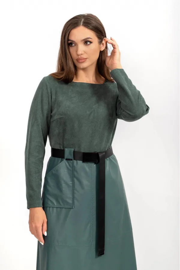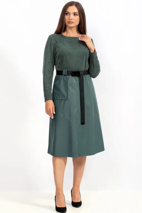 Платье женское отрезное по линии талии, слегка расклешённое, комбинированное из двух различных по фактуре тканей. Лиф платья и рукава выполнены из ткани микровельвет, юбка из ткани эко кожа. По переду нагрудные вытачки и фигурный накладной карман. По спинке талевые вытачки и застёжка молния в центральном шве спинки. Юбка четырёхклинка . Горловина круглая. Рукава двух шовные втачные. Платье без подкладки. Дополнением служит пояс. Украшают платье отделочные строчки.