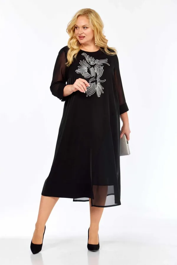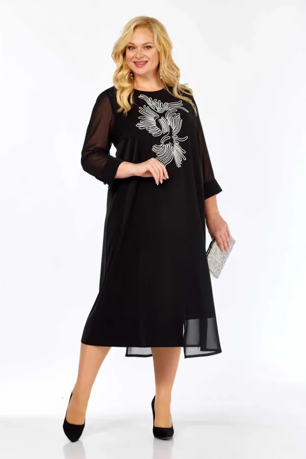 Платье женское полуприлегающего силуэта. По переду и спинке платья кокетки. От центра переда и спинки к левому боковому шву выполнен подрез с декоративной планкой. Платье украшено вышивкой. Рукав втачной, по низу на манж... Читать далее...