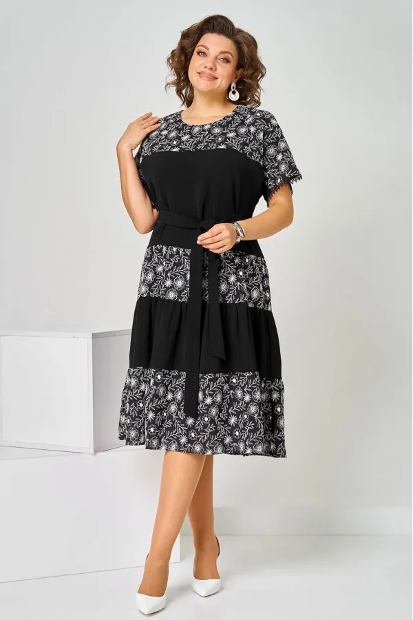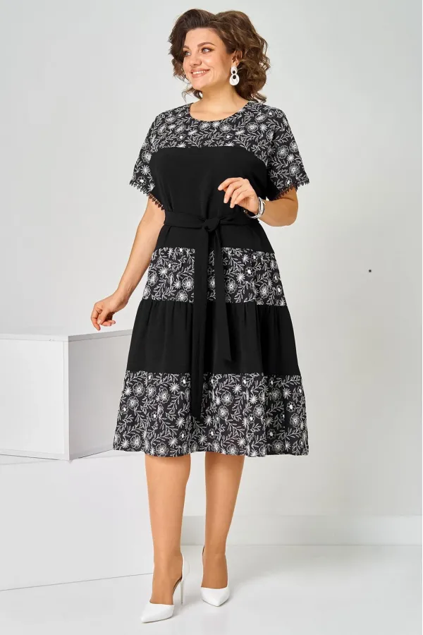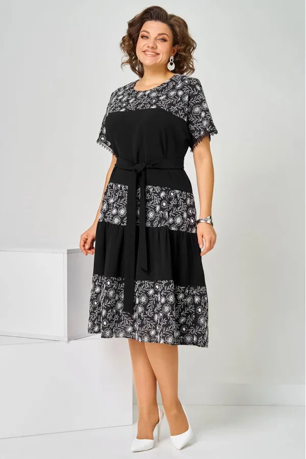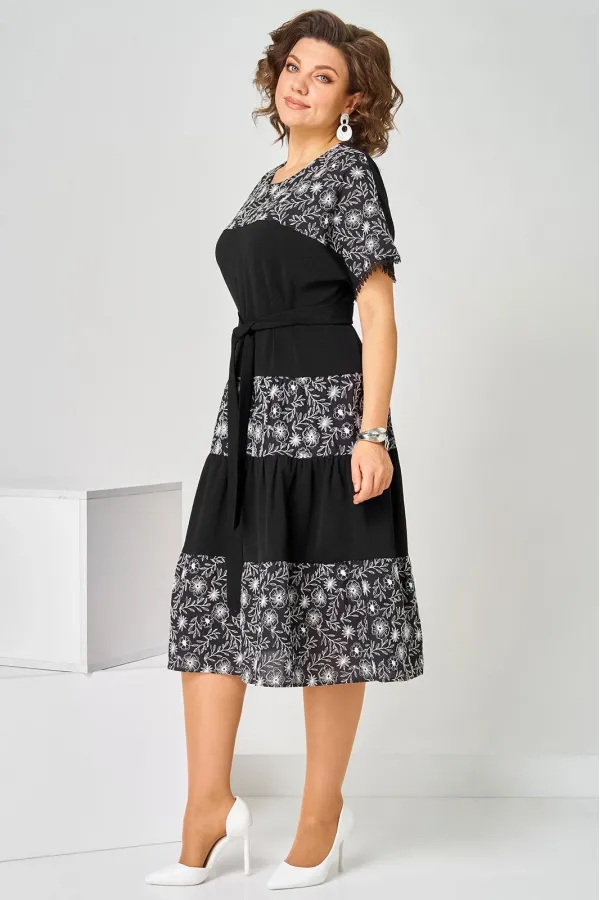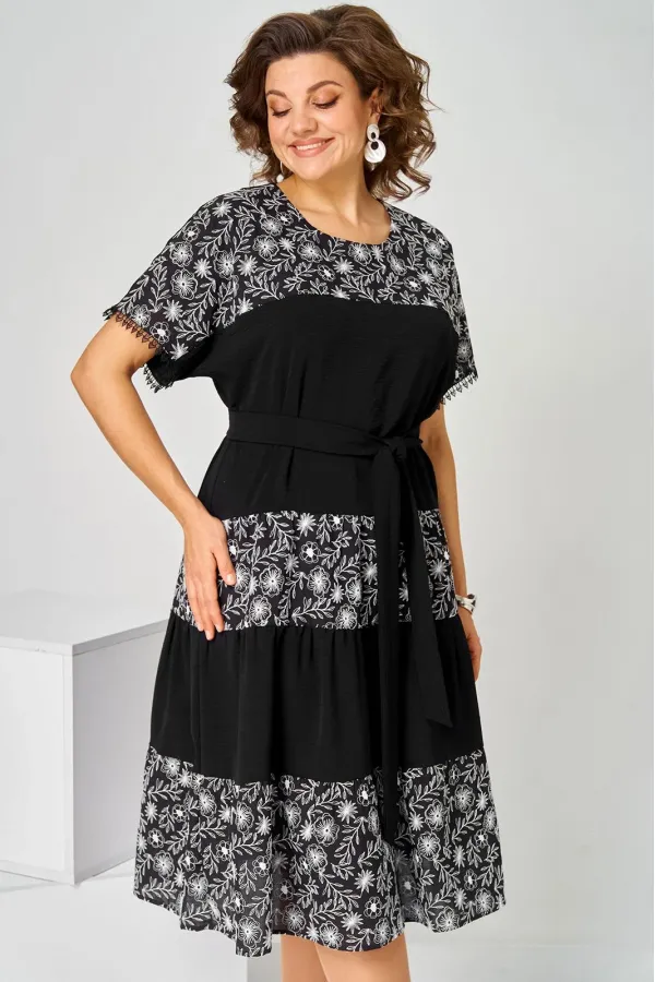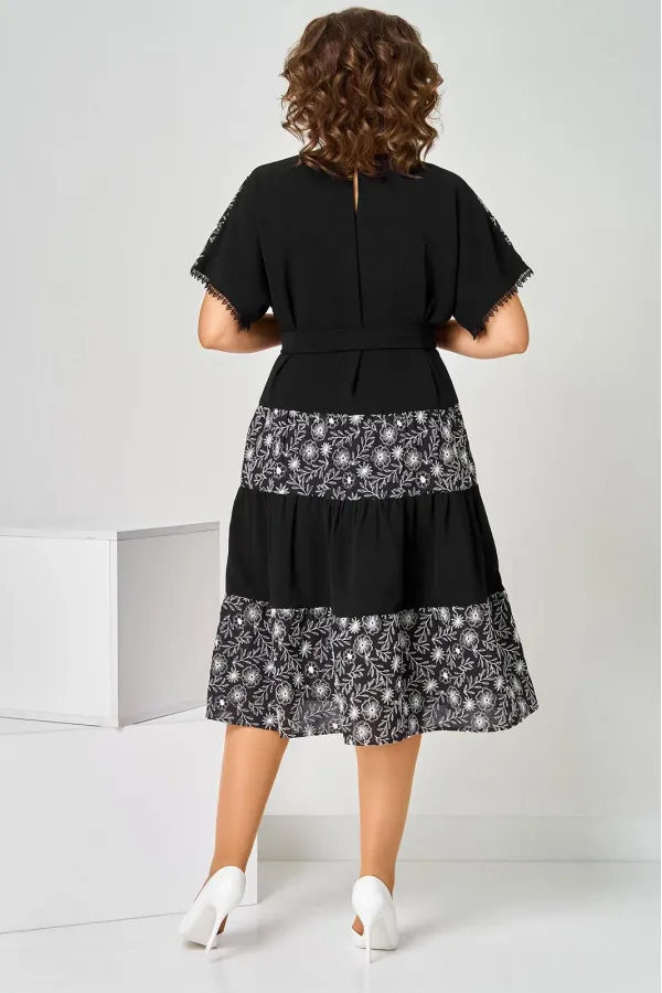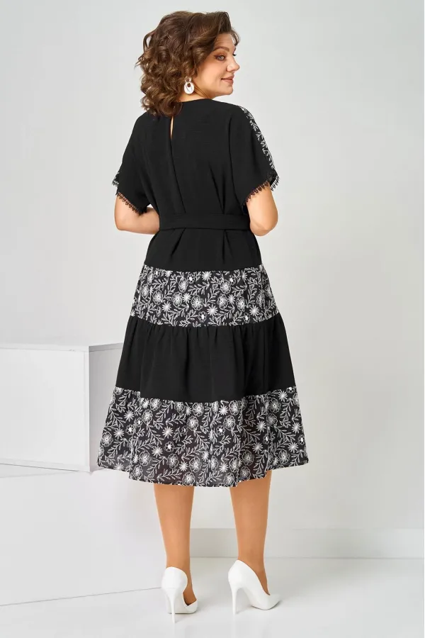Платье женское летнее, полуприлегающего силуэта из хлопковой ткани двух видов, по низу кружево. Горловина округлая. Рукав спущенный. По переду кокетка, платье отрезное по линии бедер с тремя рядами присборенных воланов. Спинка свободная. Вверху застежка на петлю. К платью прилагается пояс.Длина изделия 111 (±2) см.