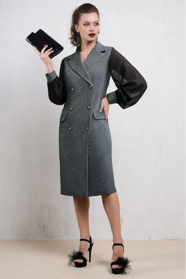 Элегантное трикотажное платье полуприлегающего силуэта с шифоновыми рукавами. Трикотаж хорошо тянется, плотный. Застежка на пуговицы спереди. На переде имитация карманов. Рукав свободный, низ обработан манжетой. Длина изделия по спинке 102 см. Длина рукава 63 см.