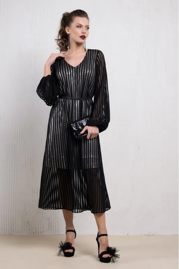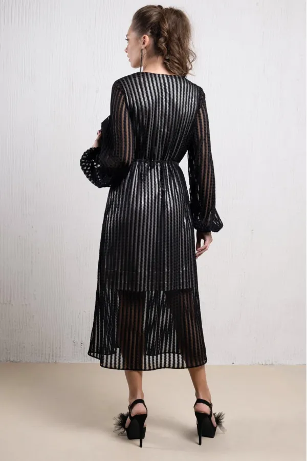 Вечернее кружевное платье свободного кроя. Основная ткань - мягкая трикотажная сетка с кружевом, хорошо тянется. Нижний слой платья трикотаж средней плотности с матовым блеском. Длина изделия по спинке 122 см, длина рукава 67 см(с учером напуска). Длина нижнего слоя платья 90 см. Рукав свободный, низ на резинке. Пояс в компплекте.