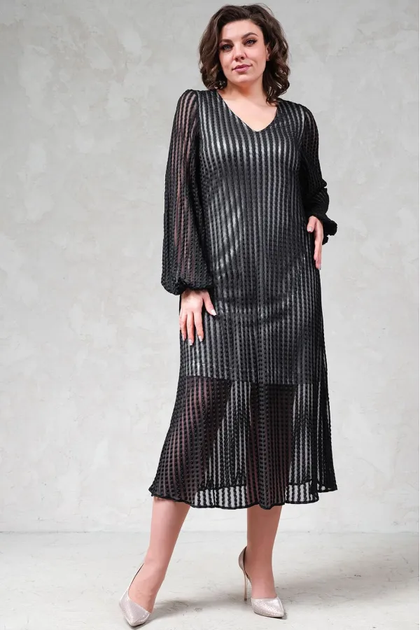 Вечернее кружевное платье свободного кроя. Основная ткань - мягкая трикотажная сетка с кружевом, хорошо тянется. Нижний слой платья трикотаж средней плотности с матовым блеском. Длина изделия по спинке 125 см, длина рукава 70 см(с учетом напуска). Рукав свободный, низ на резинке.