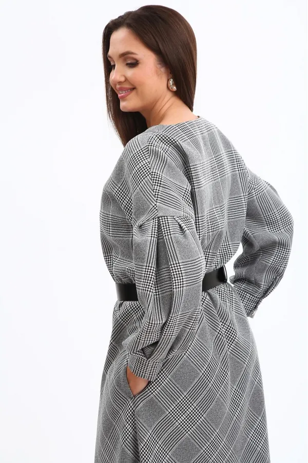 Стильное платье в клетку в трендовой расцветке, безусловно, станет фаворитом в Вашем гардеробе. Изделие выполнено из высококачественной ткани, приятной к телу. Платье А-образного силуэта, отрезное по линии талии. Рукава спущенные с активными защипами, полной длины, с притачными манжетами с застежкой на петли-пуговицы. Горловина мягкой округлой формы. Нижняя часть платья покроя трапеция. В боковых швах предусмотрены функциональные карманы. В области талии платье присобрано на эластичную тесьму. Платье дополнено стильным съёмным ремнем.