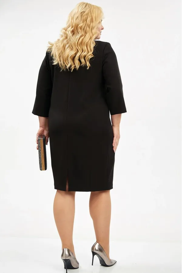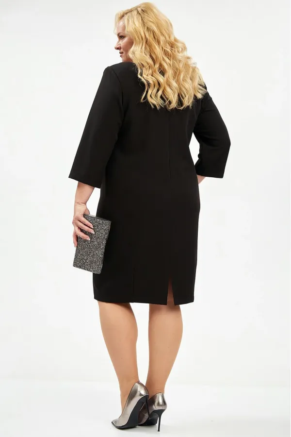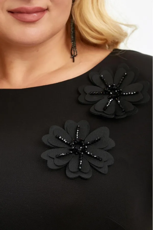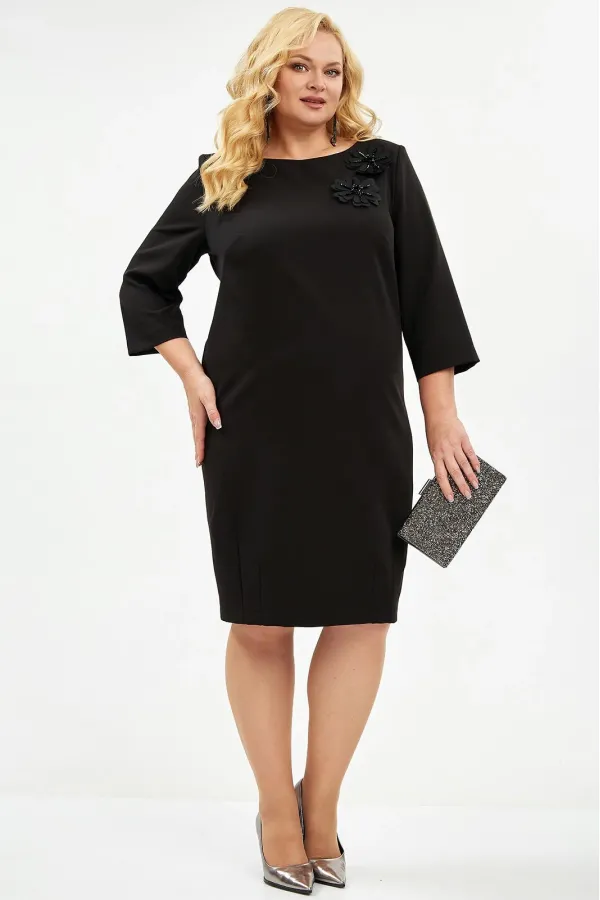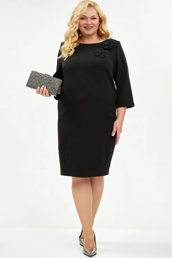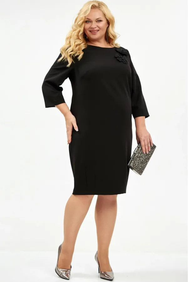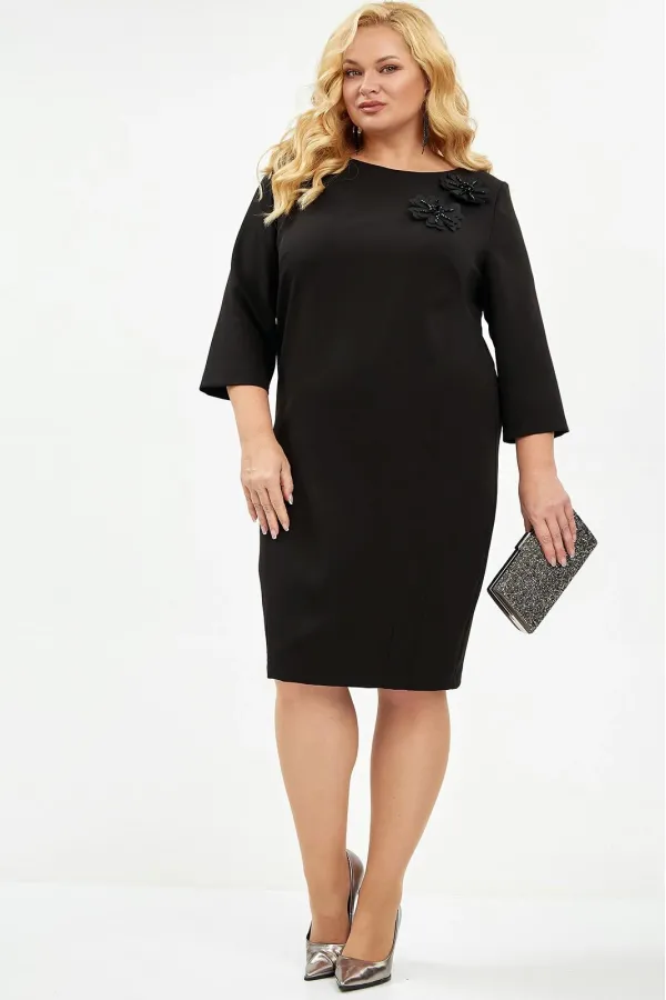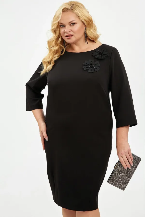 Стильное базовое черное платье О-образного силуэта, выполнено из качественной плательной ткани, что придает изделию определенную элегантность. В области низа спинки и полочки изделия расположены вытачки, благодаря которым силуэт платья принимает слегка зауженную форму. Спинка со средним швом. Сзади платье на потайной молнии. Горловина округлая типа лодочка. Рукав втачной одношовный, длина 3/4. В области груди платье декорировано съёмными цветами, что придает нежность и изящество данному изделию.
