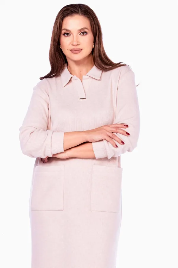 Платье с отложным воротником и планками с декоративной металлической пластинкой,без застёжки. Перед с накладными карманами. Слева вдоль бокового шва разрез ,оформленный планками и декоративной металлической пластинкой. Плечи слегка спущены. Рукава одношовные длинные,низ на двойных притачных манжетах.Подробные замеры смотрите на дополнительном фото