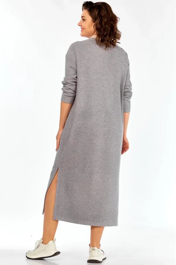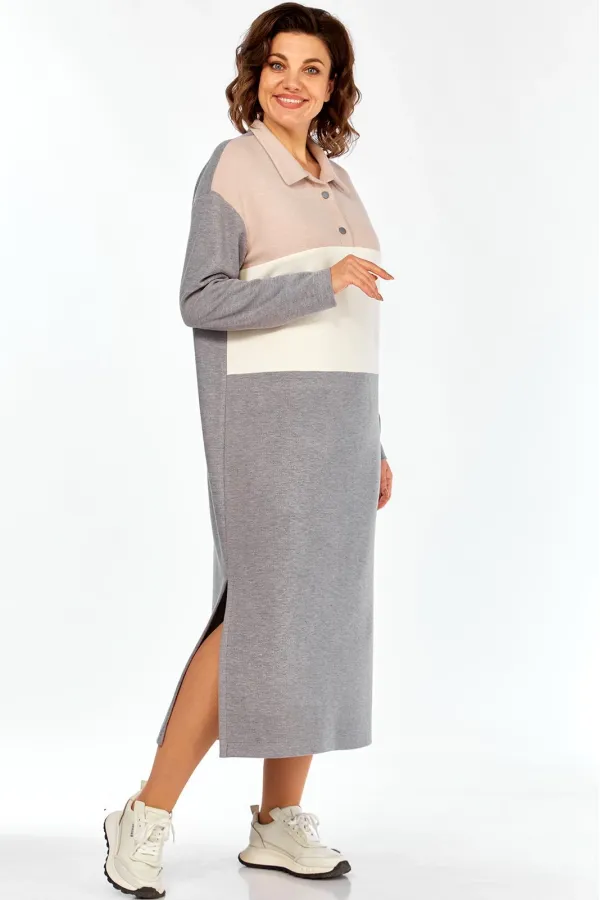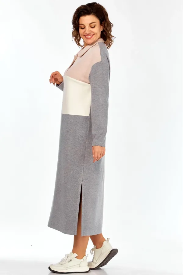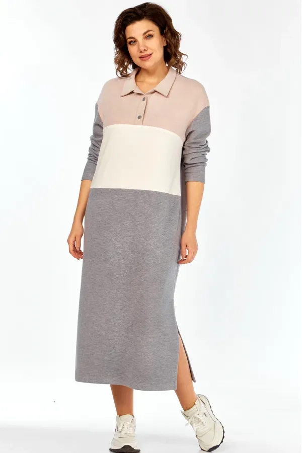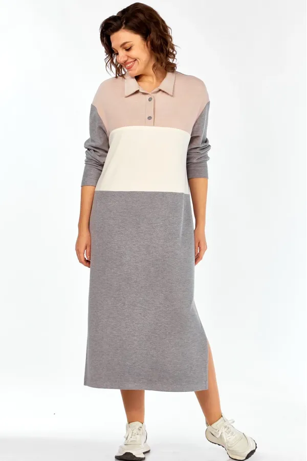 Женское длинное платье в спортивном стиле выполнено из трикотажного полотна вельвет в мелкий рубчик трёх цветов. Платье с центральной застёжкой поло на 2 петли и 2 пуговицы и отложным воротником. Перед состоит из трёх частей разного цвета:отрезной кокеткой и горизонтальным подрезом ниже линии талии . Спинка цельная.Боковые швы заканчиваются разрезами.Плечи слегка спущены.Рукава длинные одношовные.Подробные замеры смотрите на дополнительном фото